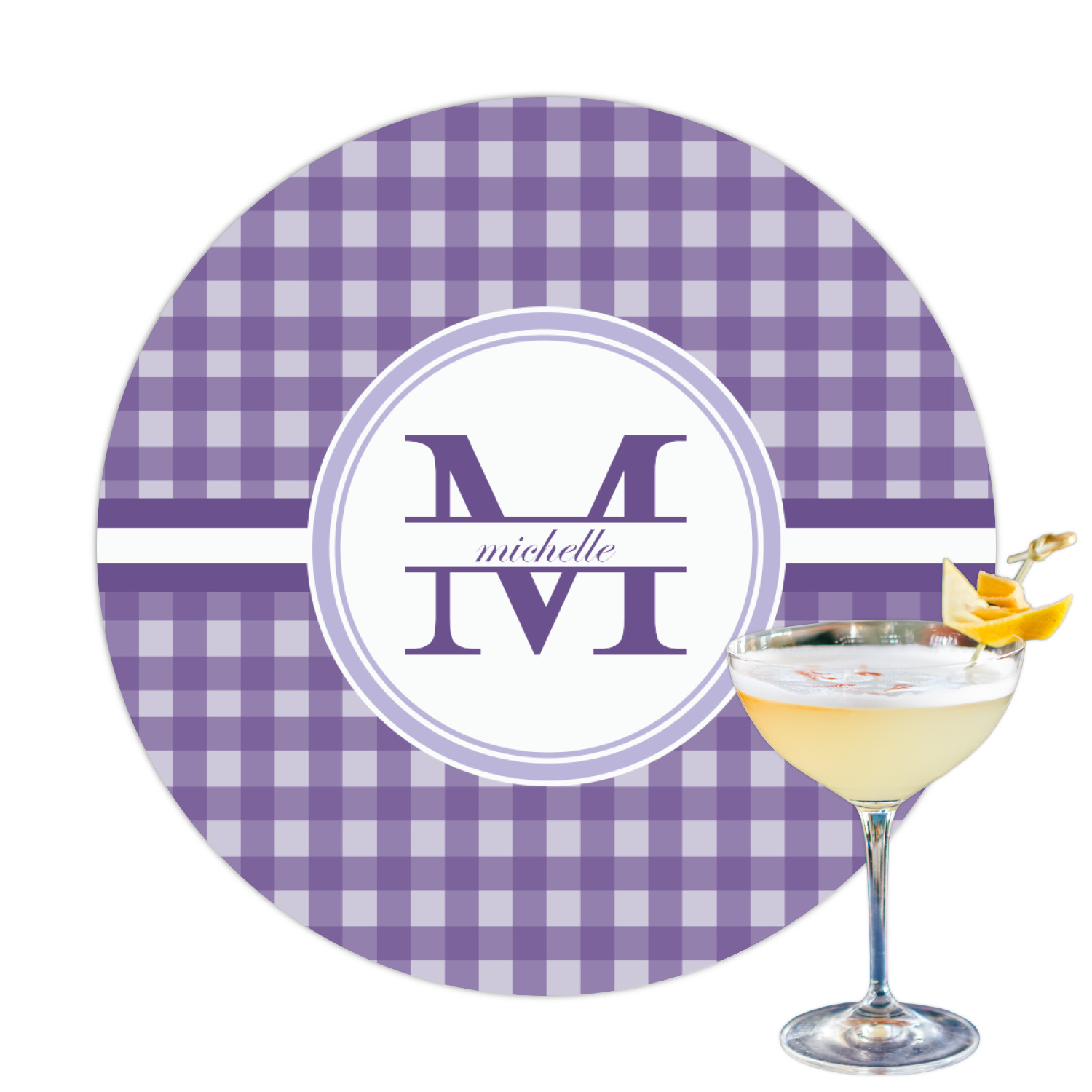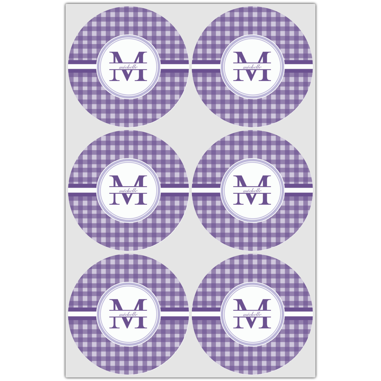 A light and dark wide purple band highlights a classic white circle label that has been exquisitely trimmed in two different shades of purple to showcase your personalization.