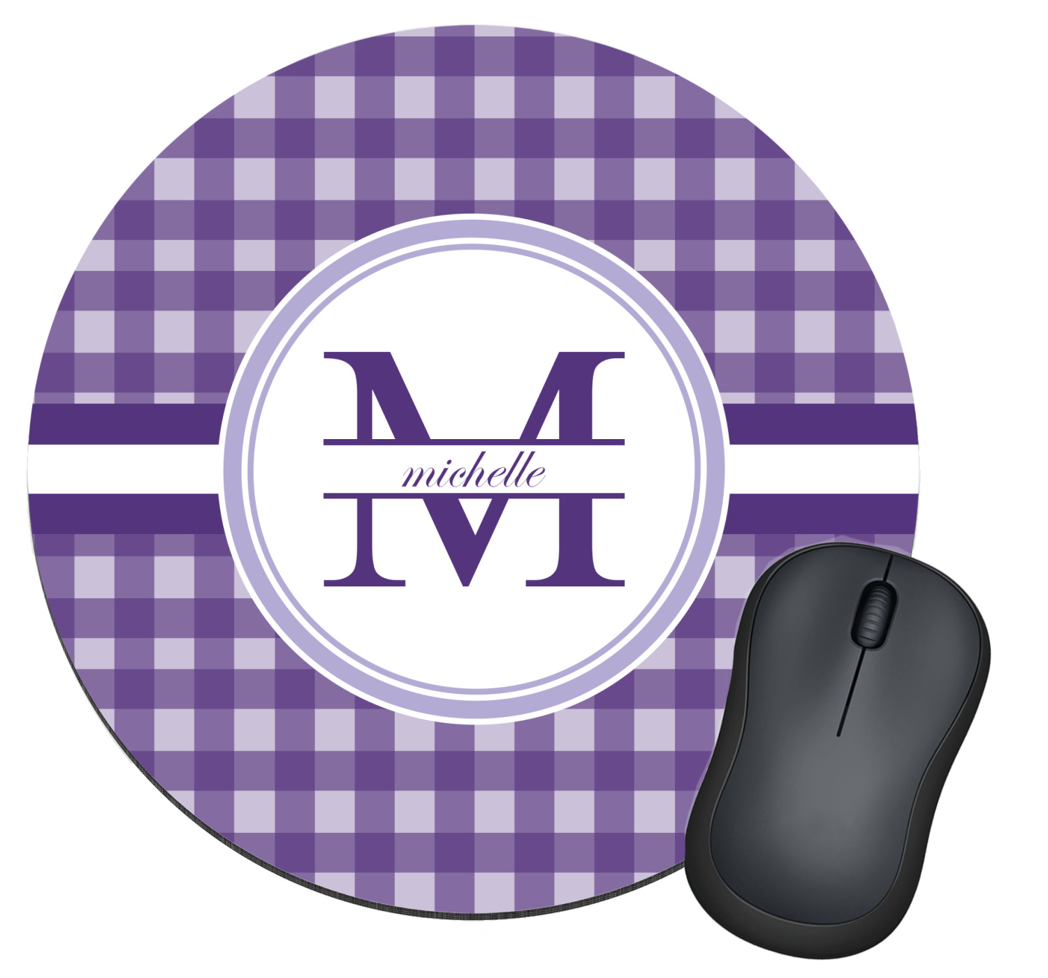 A light and dark wide purple band highlights a classic white circle label that has been exquisitely trimmed in two different shades of purple to showcase your personalization.