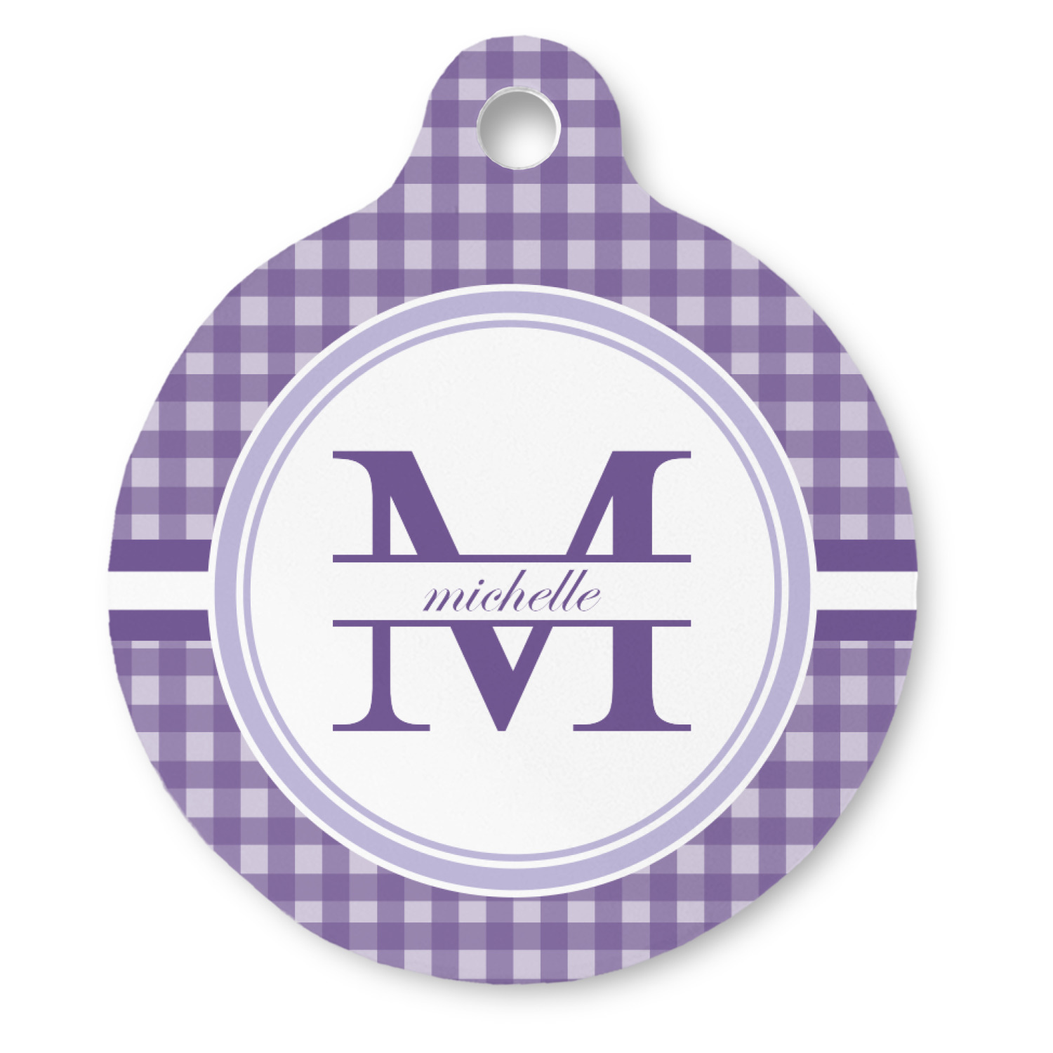 A light and dark wide purple band highlights a classic white circle label that has been exquisitely trimmed in two different shades of purple to showcase your personalization.