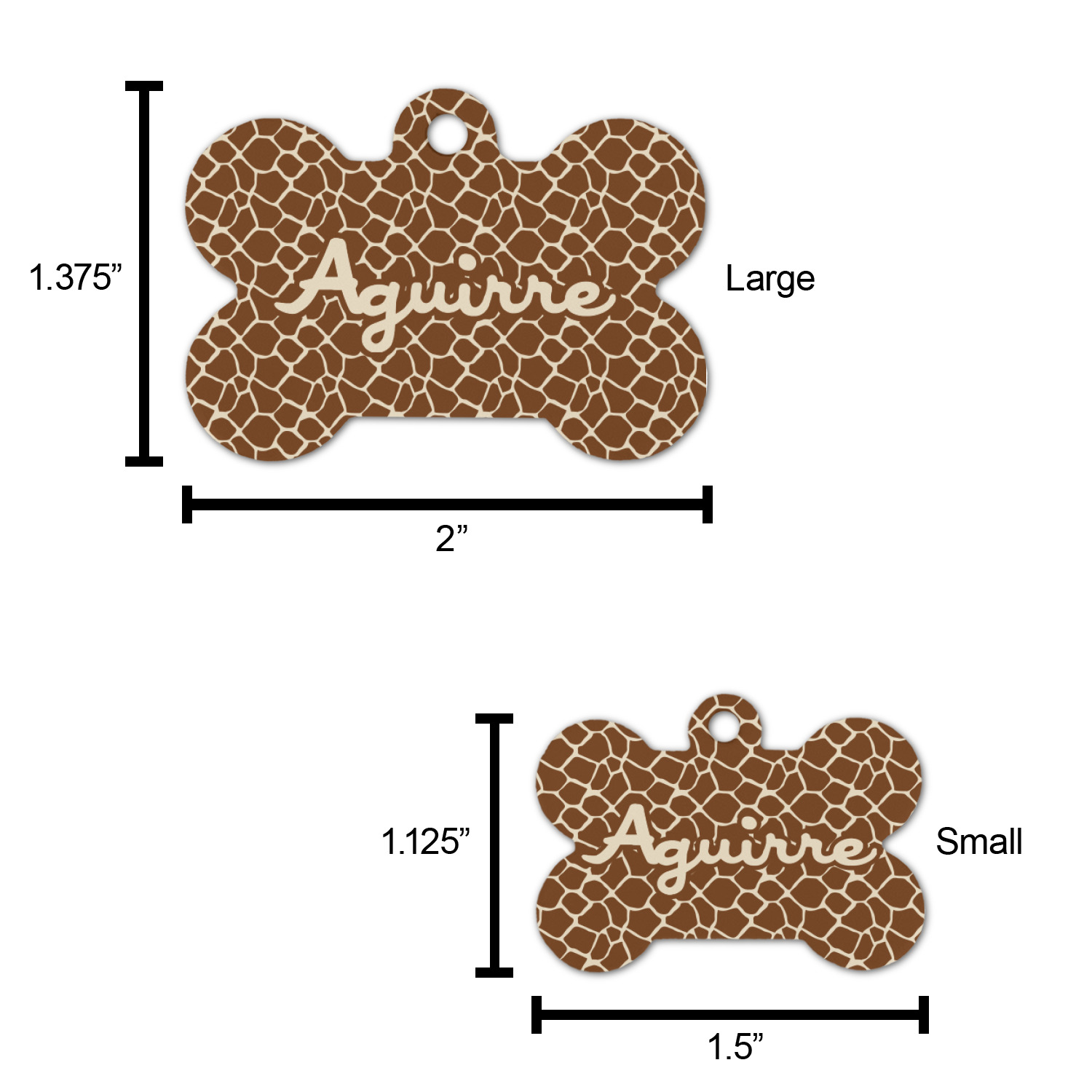 The small bone dog tag size is perfect to pair with our small dog collars, the large size pairs well with our large dog collars.