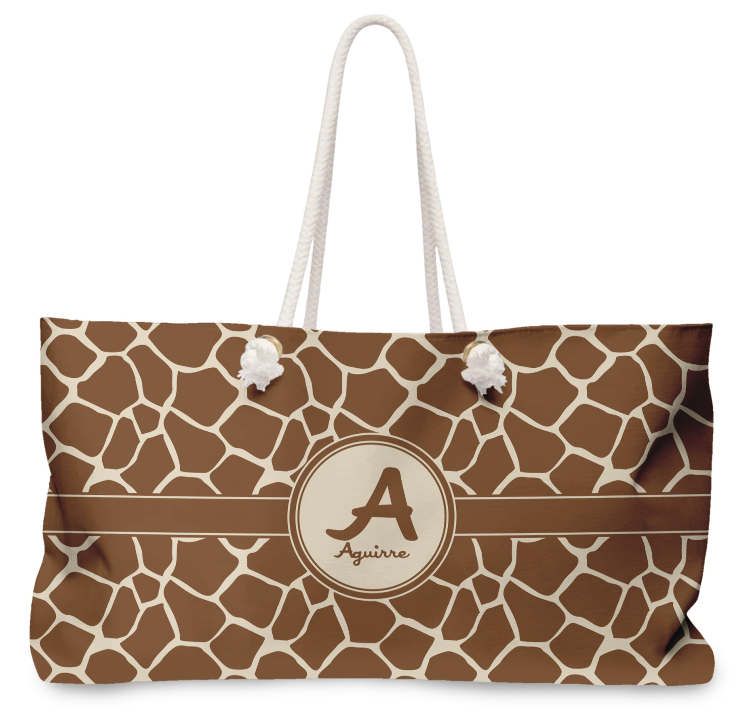 Our oversized weekender tote with rope handles is perfect for your weekend at the beach or on the town. This large tote are 24" W X 13" H, with a 5" gusset and a 27" thick rope handles with a knot that is put through a grommeted brass hole.