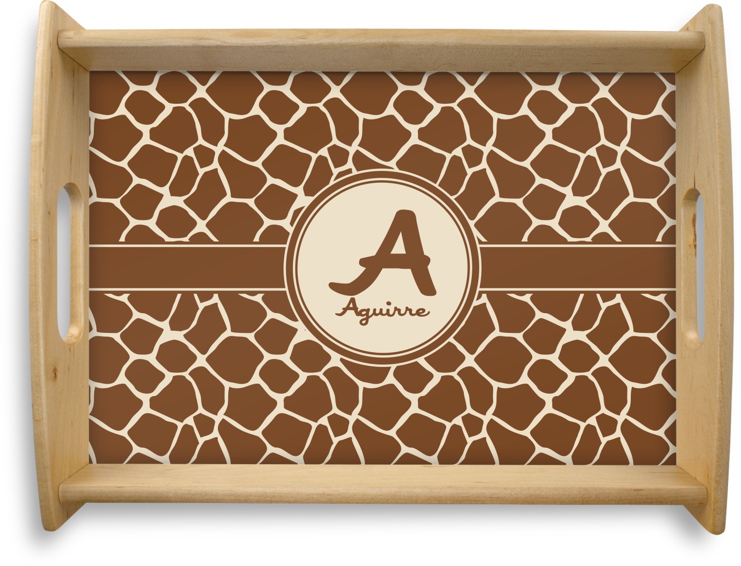This serving tray with handles features square edges and two rounded sides, creating a very modern look. Each side is fabricated from a beautifully cut, natural wood. The bottom of the interior of the tray displays your customized design in bright, vibrant color. The tray is sold in both a black color and a natural wood look. Each variation of the wood serving tray has two sizes: Small, which is 14" x 10" x 2.25", and Large, which is 19.5" x 13.5" x 2.75".