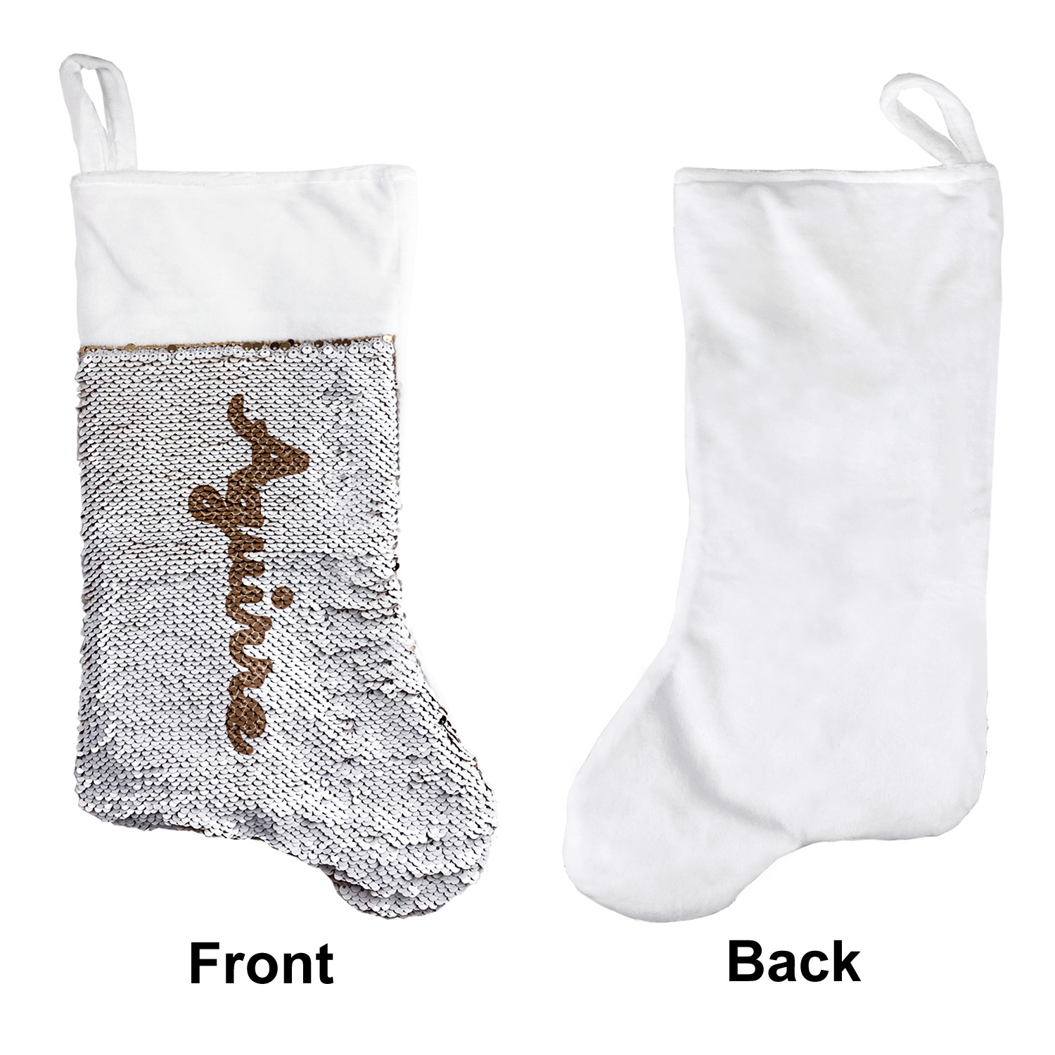 Our fun sequin stockings are made from a soft, yet durable polyester material perfect for any stocking stuffer or holiday decor! Choose from a glamorous gold stocking or classic red sequin stocking for the front color and have your personalized image printed behind for reversible fun! Our sparkly sequin stockings are super fun and decorative perfect for the family and you this holiday! Each stocking is approximately 17" x 9" with a durable loop for hanging and printed here in the US.