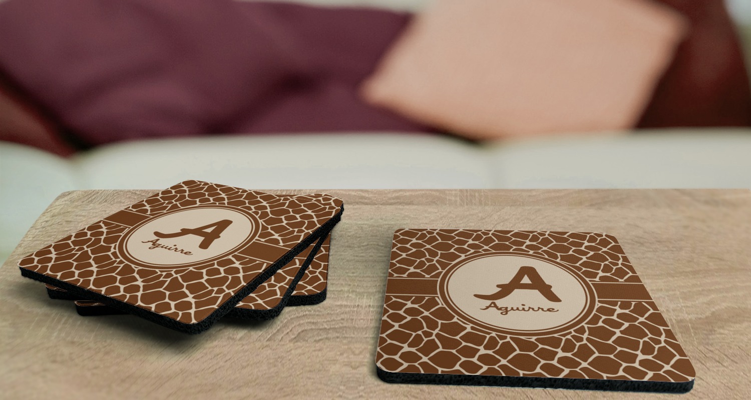 These drink coasters have a smooth, polyester top and a textured, rubber backing on its bottom. The non-slip rubber backing underneath works to keep any spills at bay. At 4 by 4 by 0.25 inches thick, these custom coasters are a suitable size for most drinkware. Your personalization is displayed atop the face of the cup coaster. We sell these rubber coasters in two different shapes: square and round. You can buy each shape as singulars or as a set of 4.