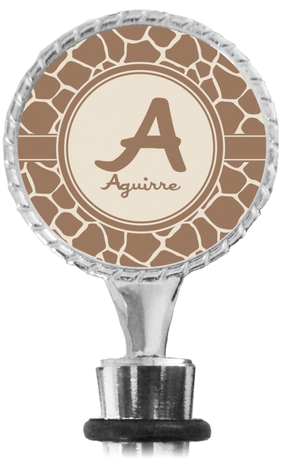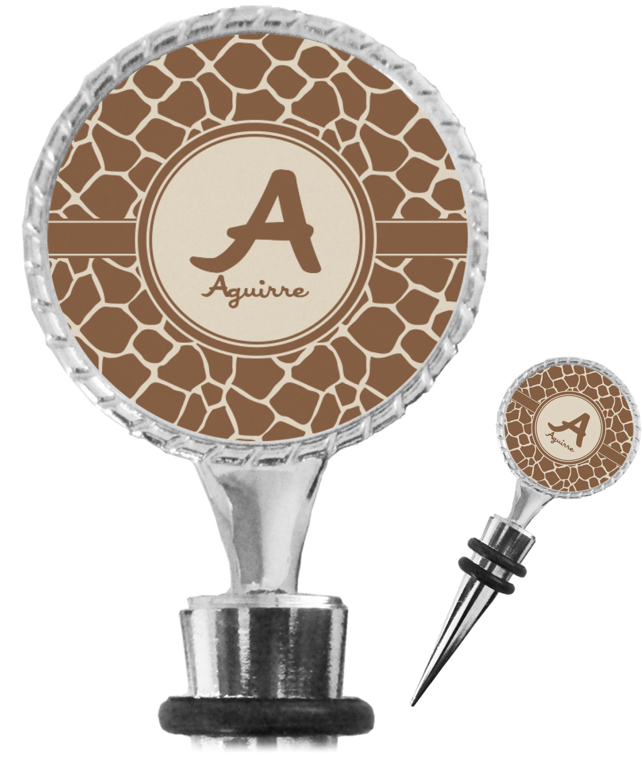 The top part of your bottle stopper is comprised of a zinc ring that displays your customization(s) in its middle, on both sides. The ring is heavy duty, with a bright chrome finish. The body of the wine stoppers have two silicone rings to provide an airtight seal. These wine bottle stoppers measure at 1.625" L x 0.8125" W x 4.625" H; your custom wine stopper is meant to fit into most standard-sized wine bottles.