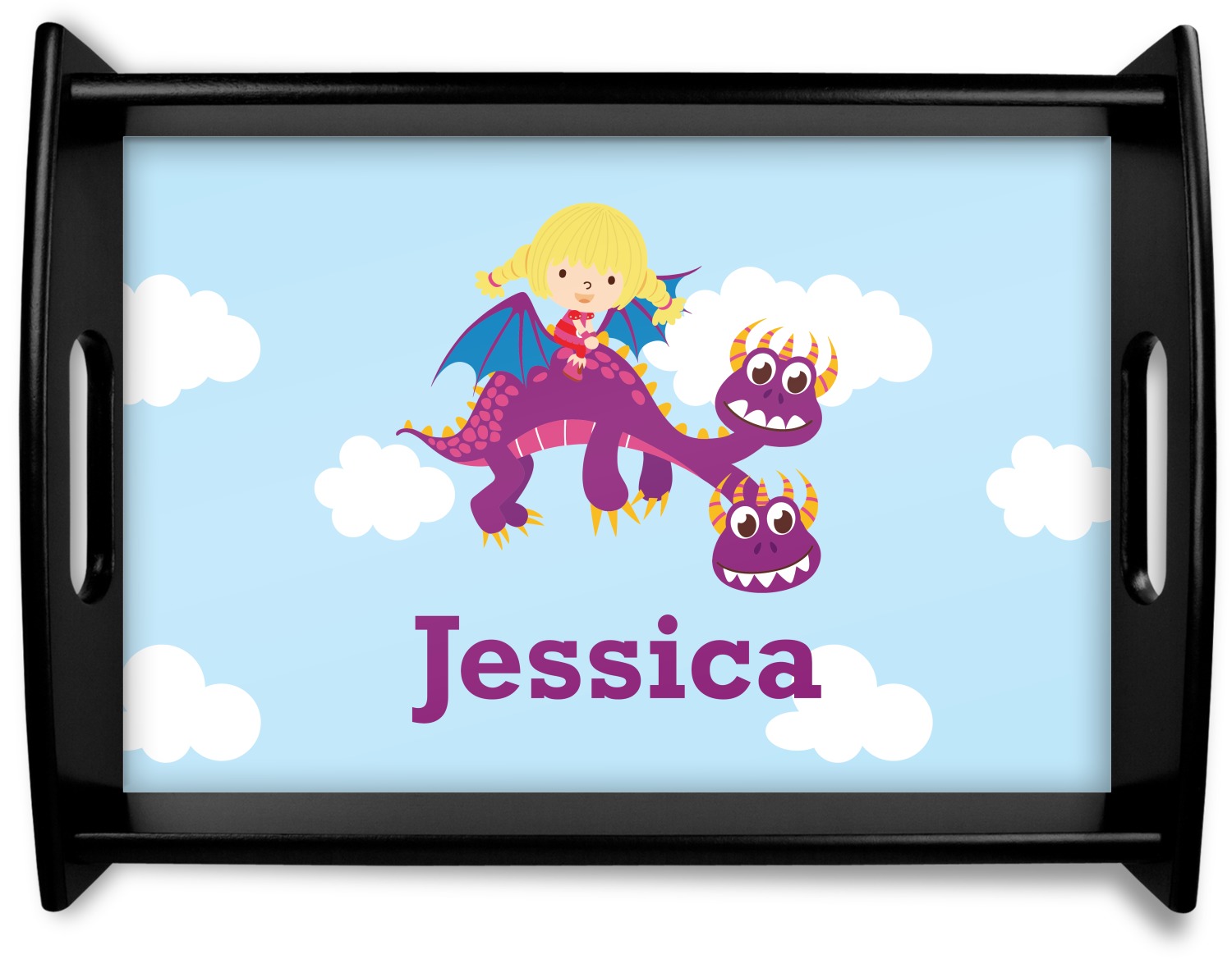 This serving tray with handles features square edges and two rounded sides, creating a very modern look. Each side is fabricated from a beautifully cut, natural wood. The bottom of the interior of the tray displays your customized design in bright, vibrant color. The tray is sold in both a black color and a natural wood look. Each variation of the wood serving tray has two sizes: Small, which is 14" x 10" x 2.25", and Large, which is 19.5" x 13.5" x 2.75".