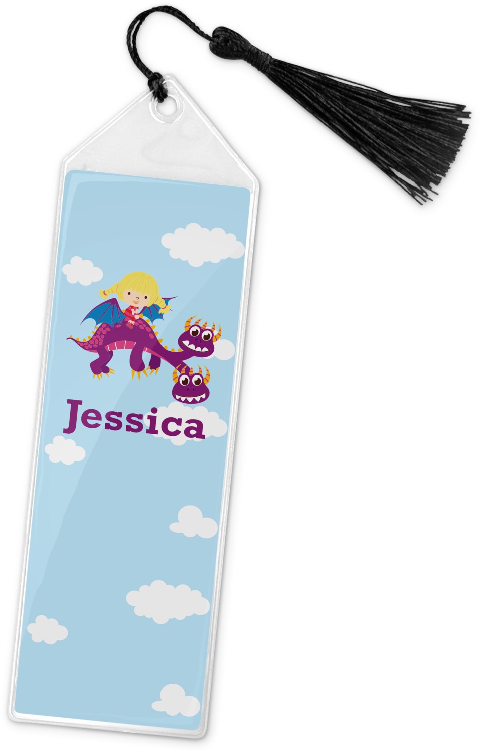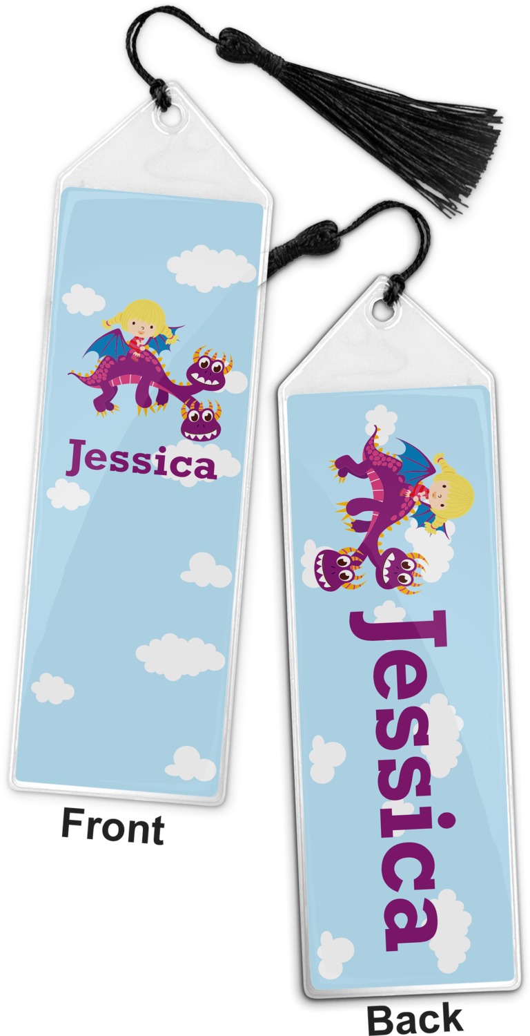 Your personalized bookmark is made of a sturdy, clear vinyl, and is approximately 7.5" x 2.25". We display your personalization on vinyl inserts that are placed on both sides. Accompanying each book marker is a black, fringe tassel that attaches to the reinforced, triangular header.