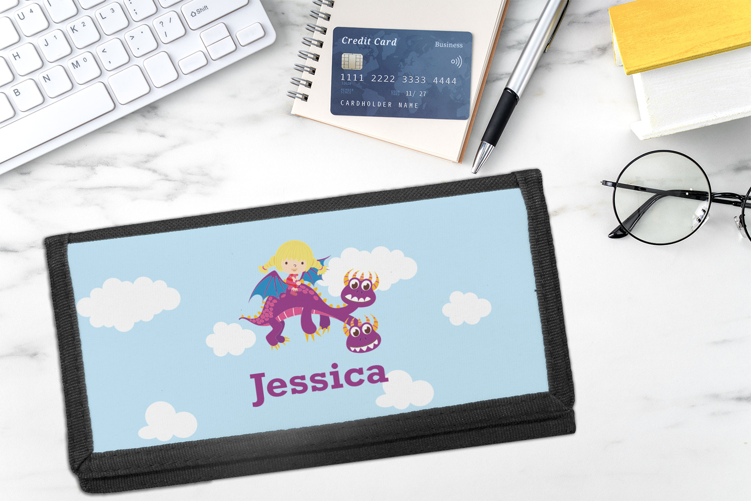 The checkbook cover is made of a durable canvas and the front flap is decorated with a vibrant design of your choosing. With 4 slots for credit cards or IDs, and 2 compartments for your checkbook register, cash, receipts, business cards, and more; this checkbook cover could easily double as a wallet.