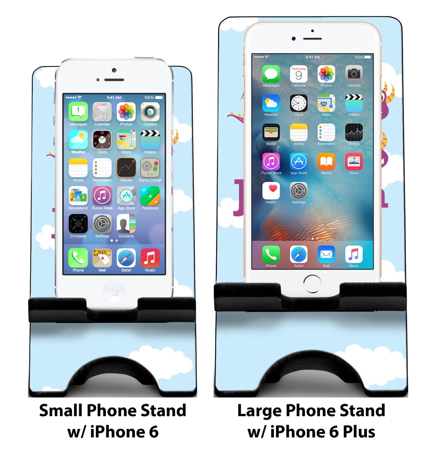 To meet your needs, we offer four variations of this IPhone stand. The backboard of the first version is shaped as a plain, yet sleek rectangle, and is available in two sizes. Our smaller size is approximately 4 by 3.25 by 7 inches, while the larger model is 4 by 3.77 by 8.5 inches. Alongside this model, we also provide you with a more decorative option. The upper part of our second version features a curved edge, for a classy, suave appearance. This phone holder is also sold in two sizes: a smaller version, which is 4 by 3.25 by 7 inches, and our larger model, which is 4 by 3.77 by 8.5 inches. Both models will support large phones, but the larger model is better if you wish to proudly display your personalized design.