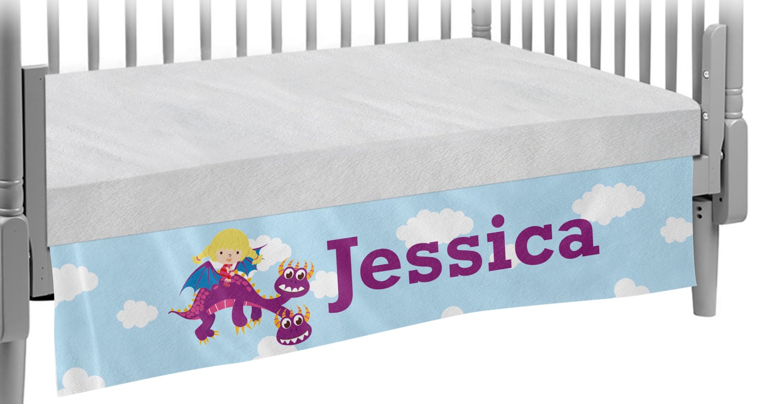 This baby crib skirt is made from two different materials and has split corners for easy placement and removal. The four corners are made from a soft, minky-like material, while the center is made of microfleece. The dual fabric makes this product durable, and still soft-to-the-touch. We provide you with the option of designing each of the four sides to be entirely unique, or to match one another, depending on your creative vision. Your personalization is displayed across the outside of the custom crib skirt, in vibrant colors. When inserted, each side panel drops 15" and is designed to touch the floor at its lowest setting.