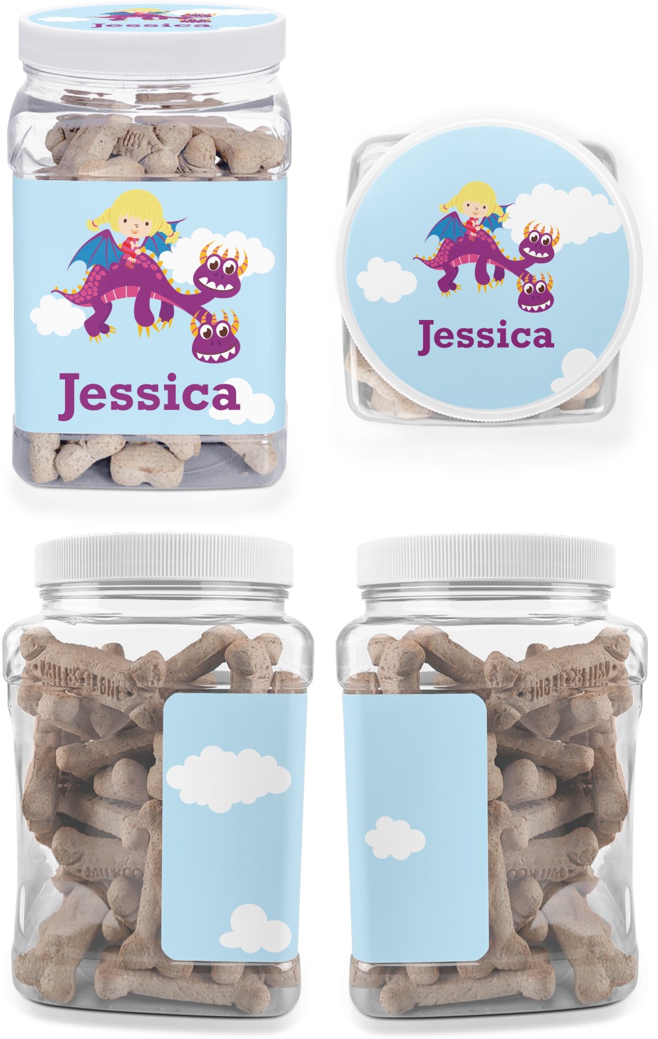 This half gallon jar, made from a sturdy plastic, is the perfect way to keep treats from any naughty pet paws, while still keeping them ready on hand for when your pup performs an impressive trick. This dog cookie jar features a screw-on, white lid that displays your personalized design on a vinyl sticker. We apply another customized sticker that wraps around the front and sides of the jar. Our dog treat jar also has indentations on the rear ends of the sides, which allows for convenient handling, and its square frame allows for easy storage.