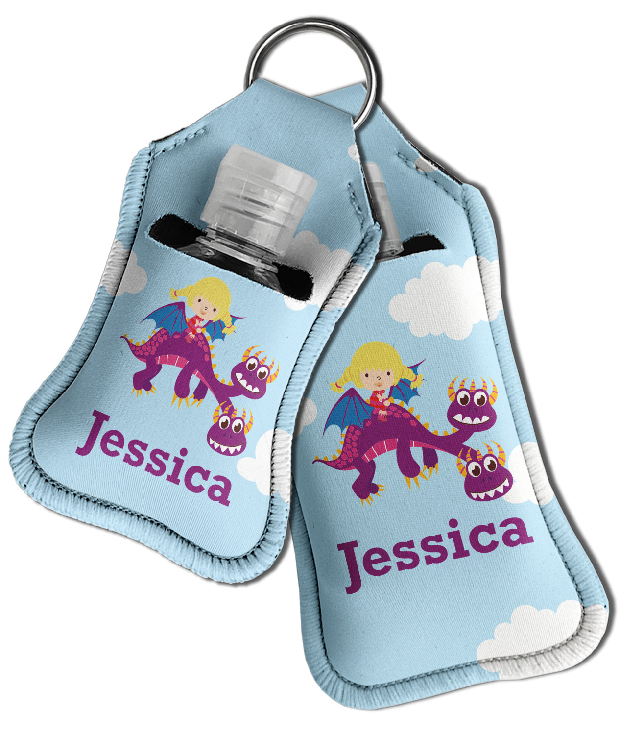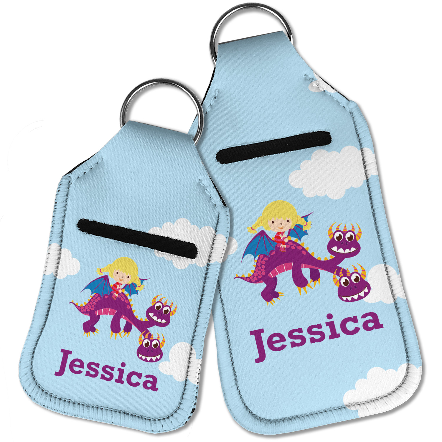 Each hand sanitizer holder comes with its own empty travel-sized, refillable hand sanitizer sure to fit snug in your customized sanitizer case! Our hand sanitizer cases are a durable, yet soft neoprene material sure to last any daily activities or travel agenda. Customize and personalize a hand sanitizer bottle holder with one of our two sizes - small (4.25" x 2.25") or large (5.5" x 2.5"). Each travel sanitizer holder comes with a keyring for attachment on bags, keys, or more!