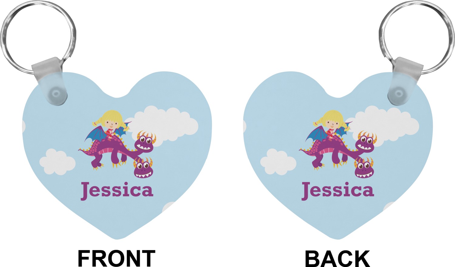 Our personalized keychains attach to the included metal, split key ring with a plastic, removable snap. Since a metal ring is included with your purchase, you have the liberty to keep your keys together on the ring, with or without your unique keychain. We offer this keychain in three different shapes: circle, heart, or diamond. We print your personalized design(s) on both sides of the key chain, and the surface has a glossy, reflective finish that only emphasizes your design. Each keychain is approximately 2.25 by 2.25 inches.