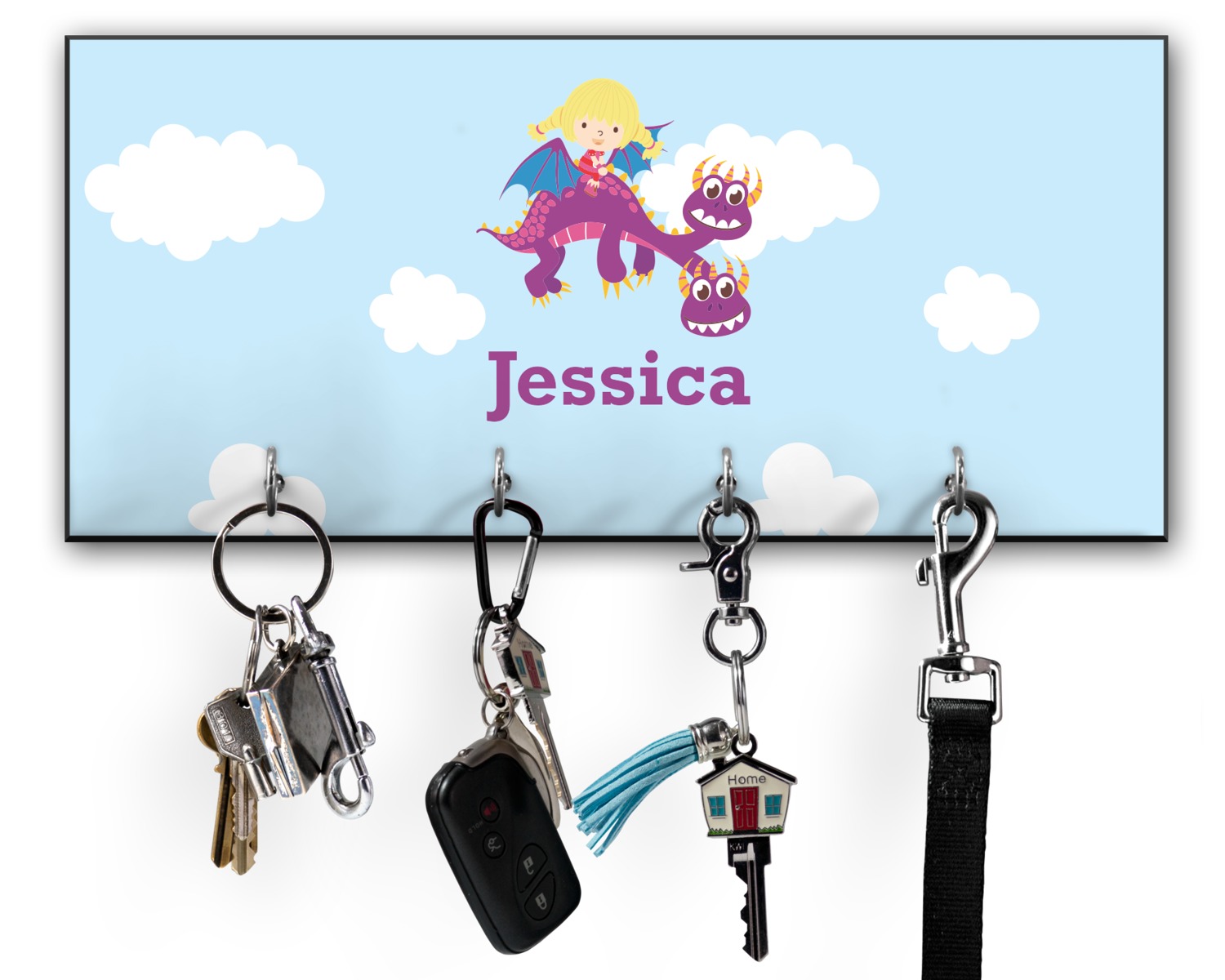 This 11" x 5" key hanger is made of sturdy wood and has four metal hooks lining the bottom. This is the perfect size for a family with several drivers. Not only can you hang keys on it though, but pet leashes and other small items. The board is black on the sides and back and is printed with the design of your choice on the front.