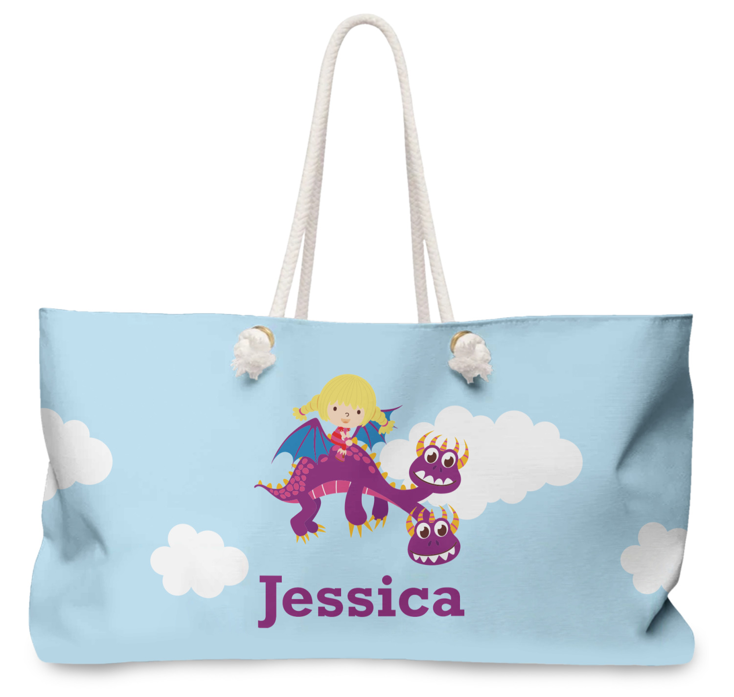 Our oversized weekender tote with rope handles is perfect for your weekend at the beach or on the town. This large tote are 24" W X 13" H, with a 5" gusset and a 27" thick rope handles with a knot that is put through a grommeted brass hole.