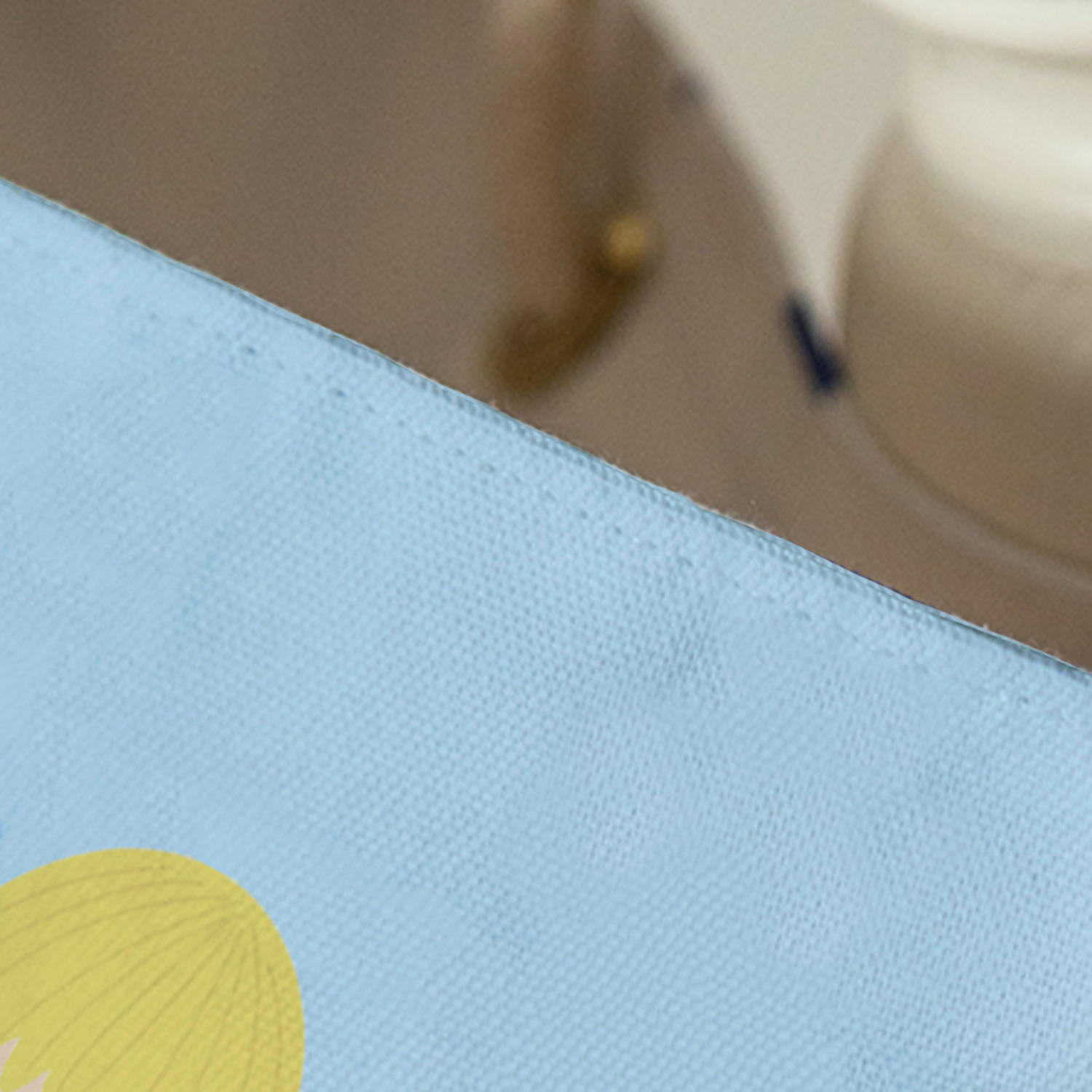 These large totes are handmade i.e. printed, cut and sewn right here in the USA. The canvas like material is printed using dye sublimation; the fabric is then cut and sewn along with a beautiful cream colored lining (to match the rope handles). The brass grommets are then added and the cream colored rope if fed through the grommets and knotted.