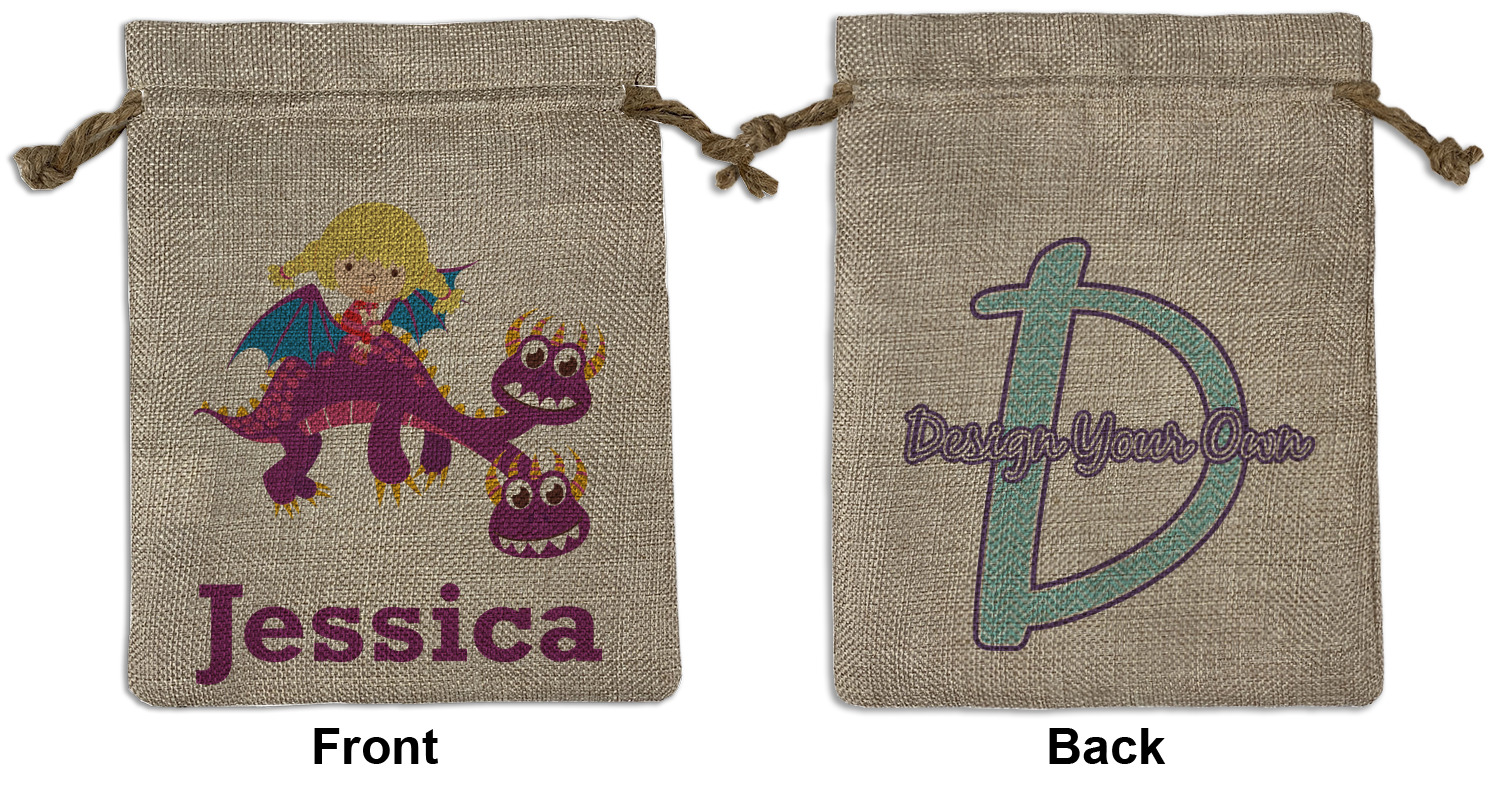 We sell our Burlap Gift Bags in 3 variant sized bags. Made with burlap polyester, each personalized bag can be secured with a twine drawstring pull. Your custom design is available to print on one side or both sides - completely up to you! The sizes of the bags measure approximately 4.5" x 6.5" for the smallest size, 6.5" x 8.0" for the medium size, and 6.5" x 13.5" for the large-sized bag.