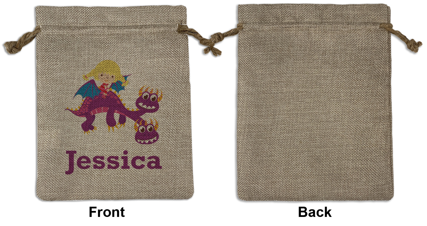 We sell our Burlap Gift Bags in 3 variant sized bags. Made with burlap polyester, each personalized bag can be secured with a twine drawstring pull. Your custom design is available to print on one side or both sides - completely up to you! The sizes of the bags measure approximately 4.5" x 6.5" for the smallest size, 6.5" x 8.0" for the medium size, and 6.5" x 13.5" for the large-sized bag.