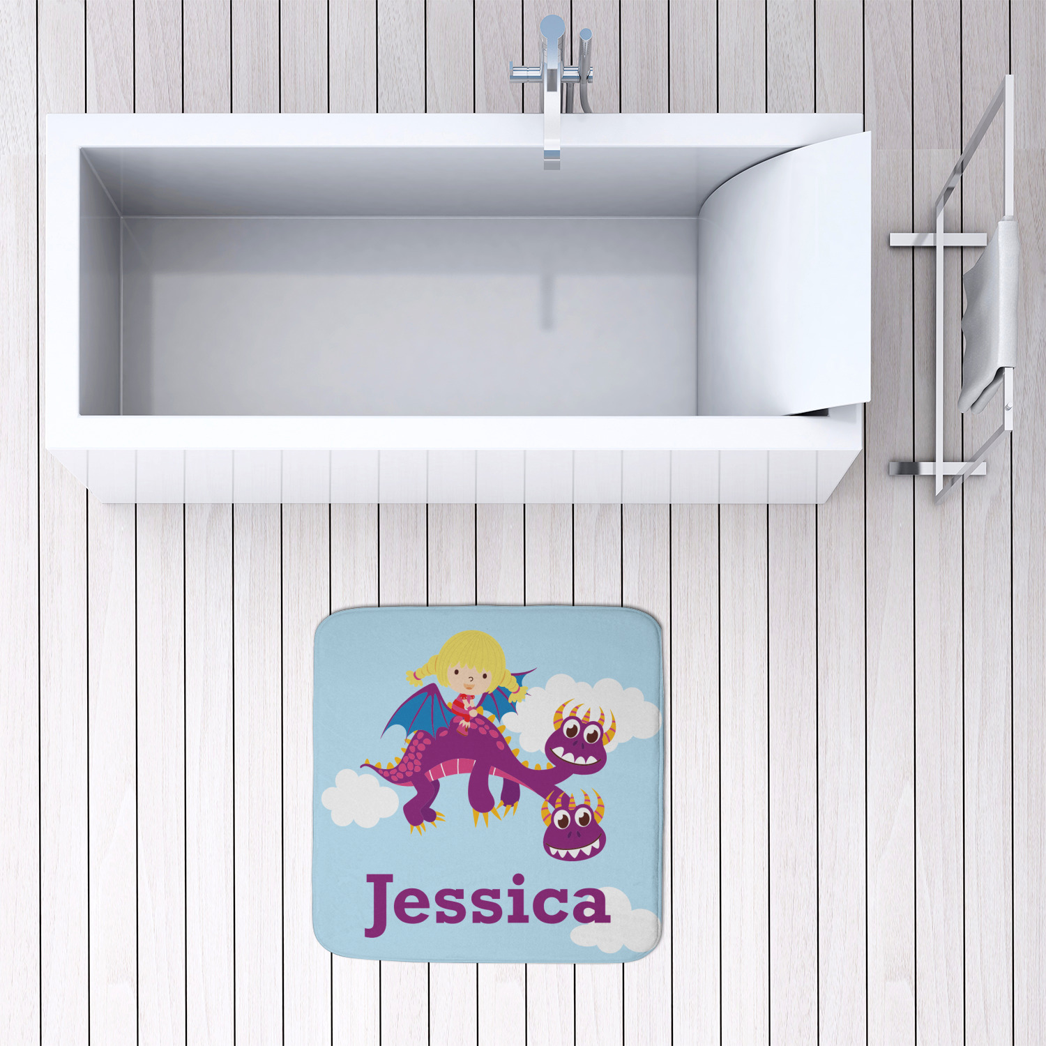 We offer this custom bath mat in four different sizes, so that you can choose the proper size for your bathroom and shower space. We suggest measuring the area before so that you can make an informed purchase. The four sizes are as follows: 24 by 17 inches, 34 by 21 inches, 48 by 36 inches, and 48 by 48 inches.