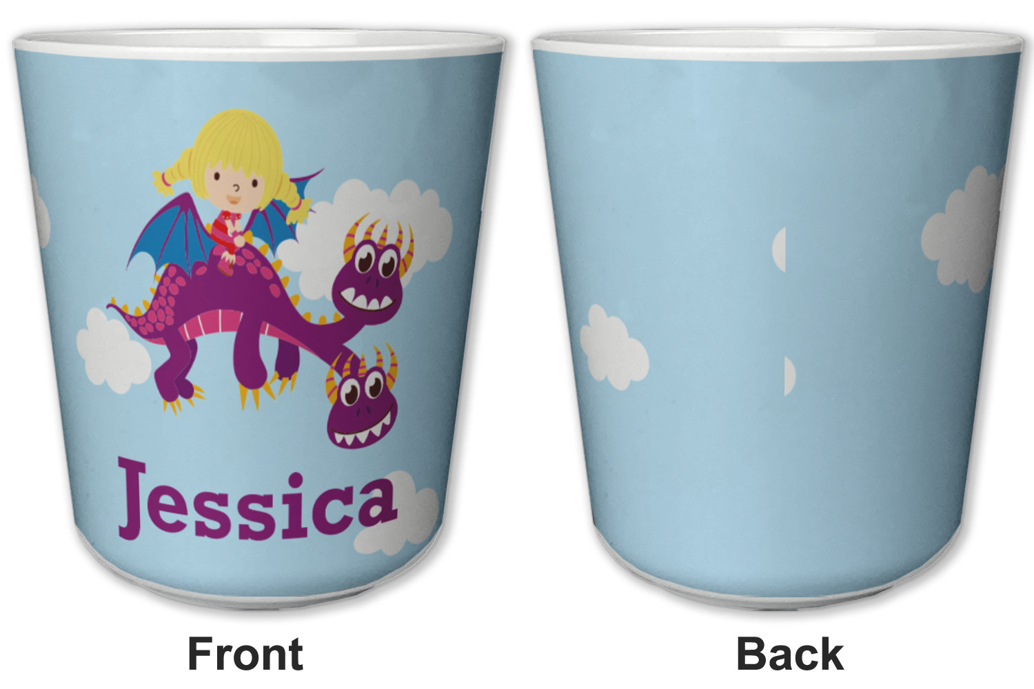 Made from a durable plastic, these tumbler cups are strong enough to withstand daily use and are perfect for young children. Each of these personalized plastic cups holds 6 ounces and measure at approximately 3" x 3" x 3.25". Place them in the bathroom as a rinsing cup, or give them to your kids during mealtimes. These 6 oz. plastic cups are BPA free, microwave and dishwasher safe, for your convenience. Your personalized design is displayed across the entire outside of this cup, while the inside is white in color to make your customization really stand out.