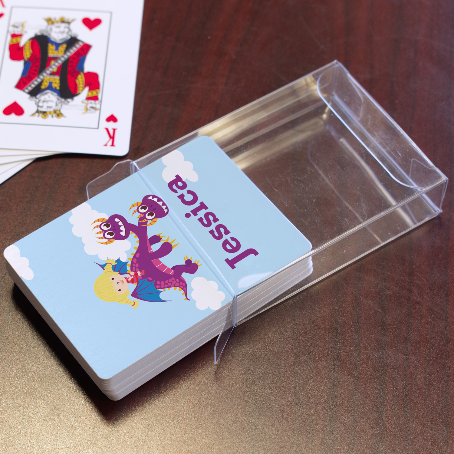 The customization / personalization is printed on the back side. The playing cards have a low gloss coating on both sides. The cards are packaged in a clear plastic box.