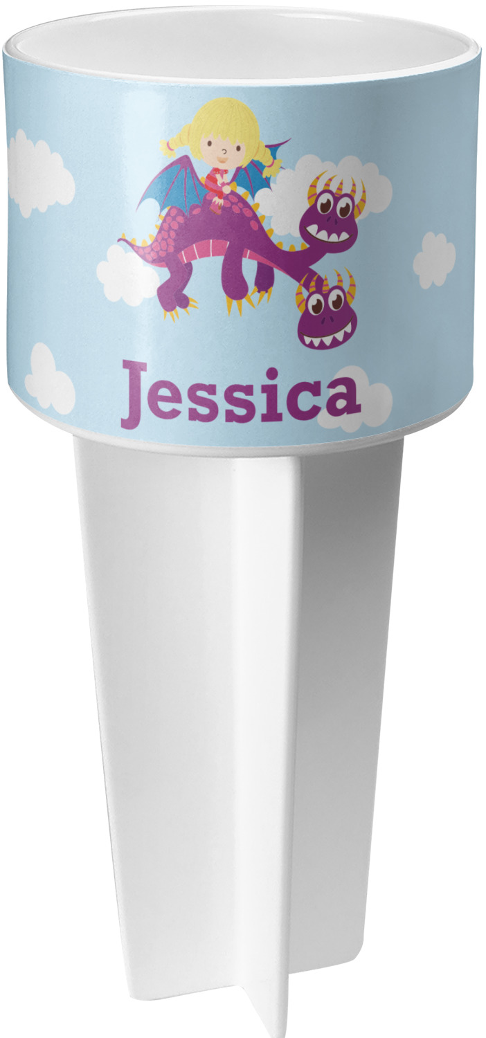 This cup holder has a large stake at its bottom that anchors it to the sand or ground below, while the cup holder rests above the stake. The entire drink holder is made of durable plastic and displays your customization around the cup holder portion. We sell these personalized beach spikers in two different colors: black and white.