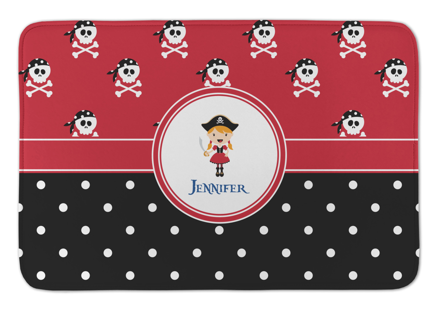 A wide band of red, trimmed in white highlight the little pirate girl in the circle label. Add your personalization in the label to complete the look.