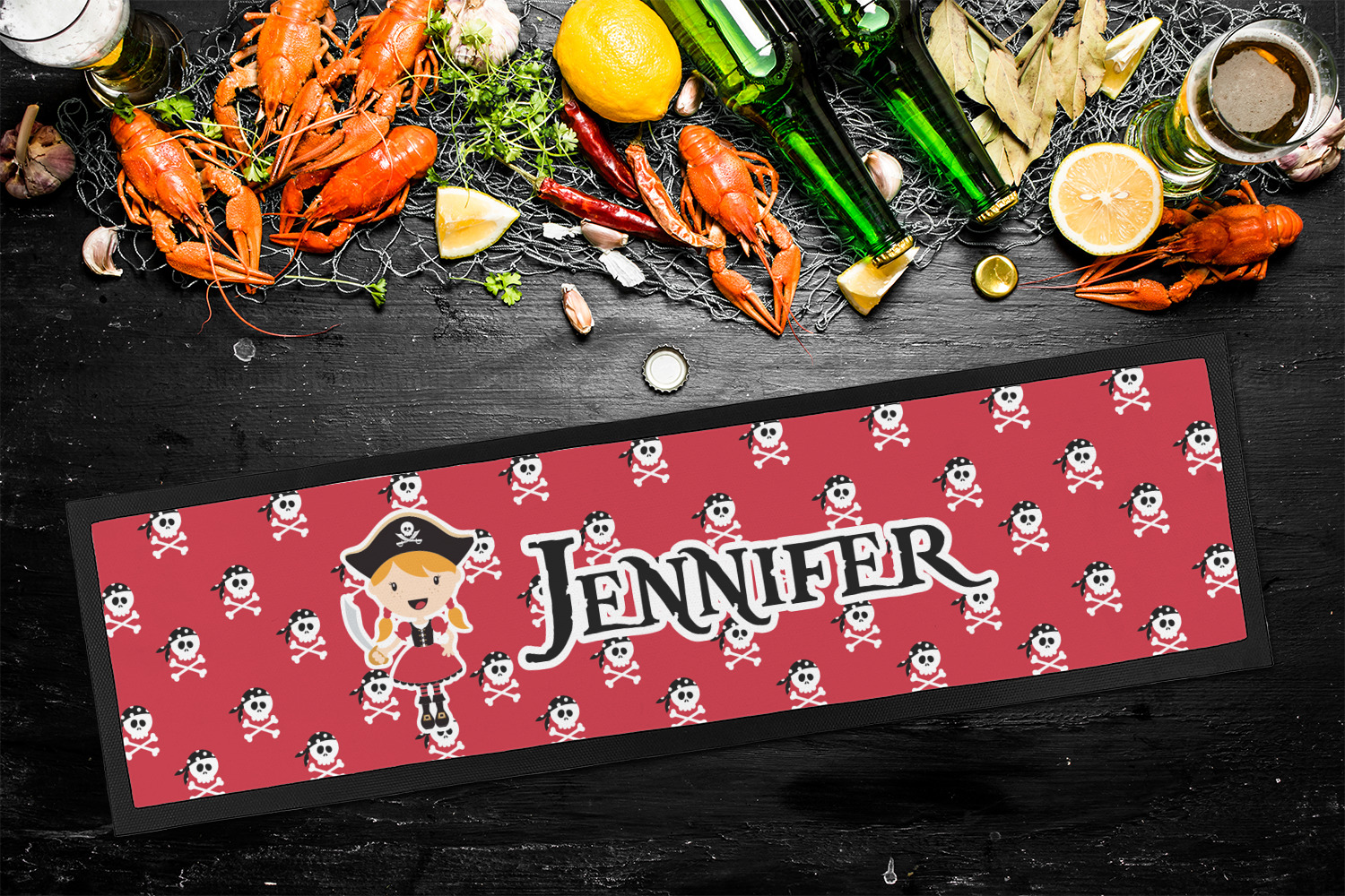 A wide band of red, trimmed in white highlight the little pirate girl in the circle label. Add your personalization in the label to complete the look.