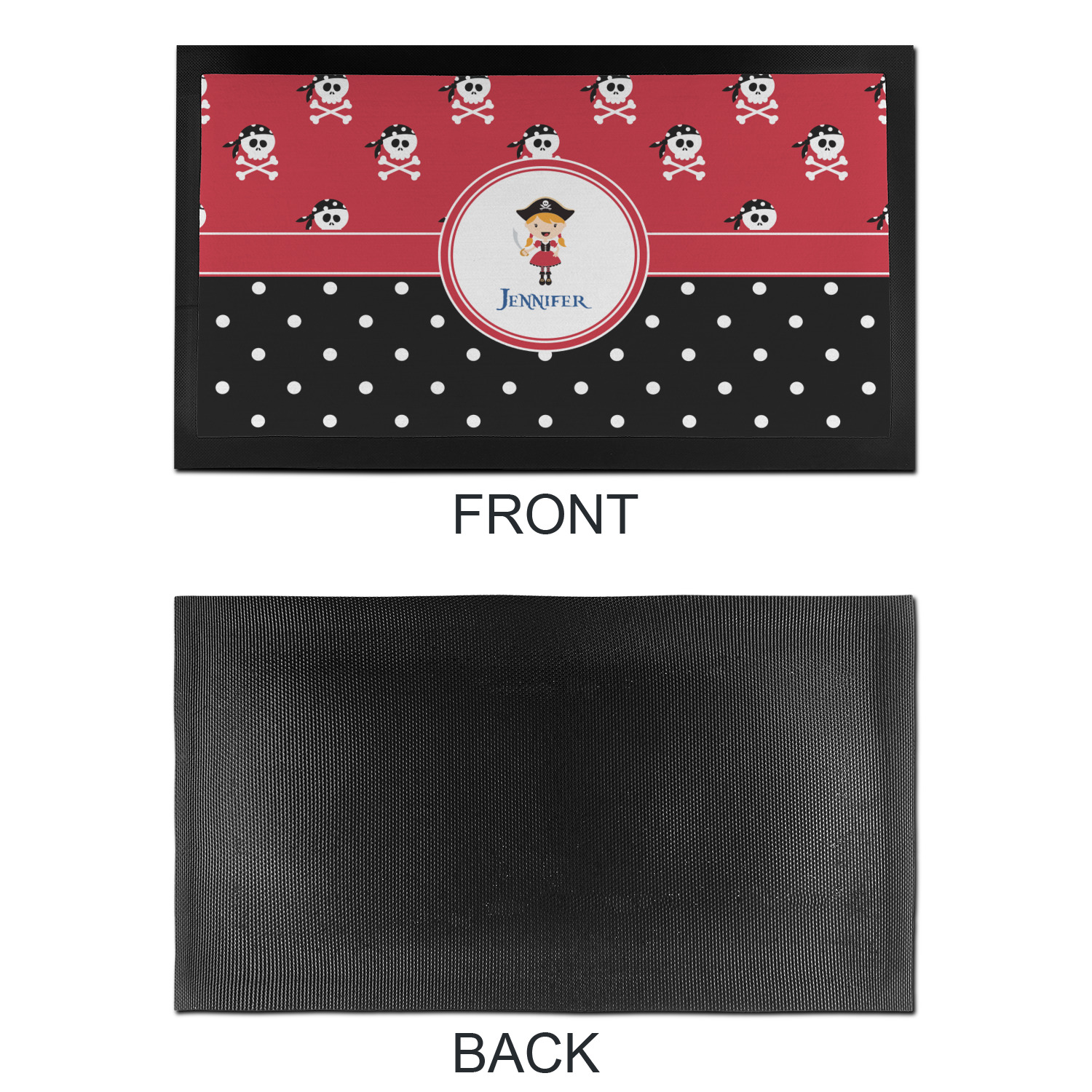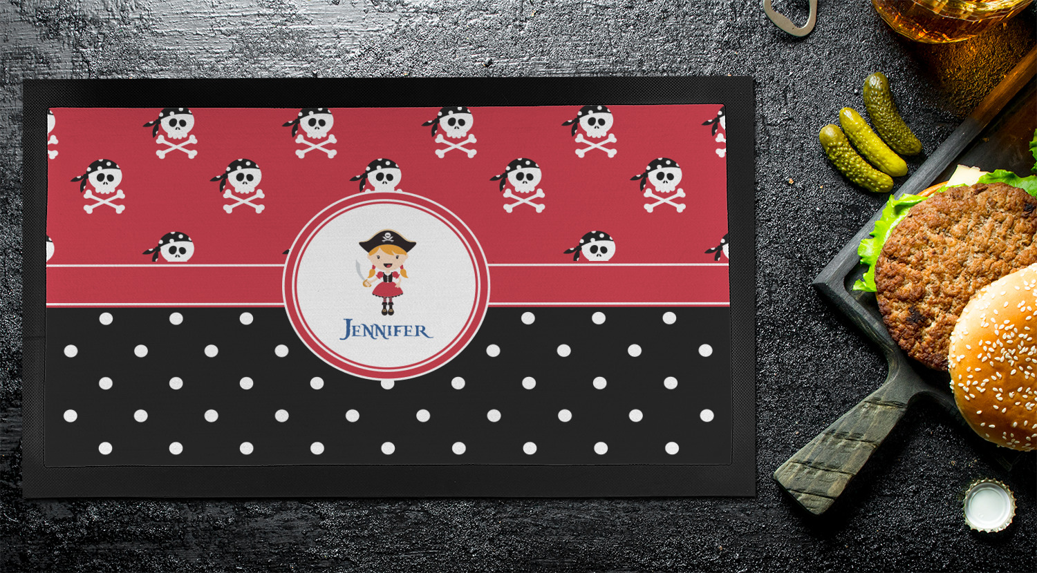 A wide band of red, trimmed in white highlight the little pirate girl in the circle label. Add your personalization in the label to complete the look.
