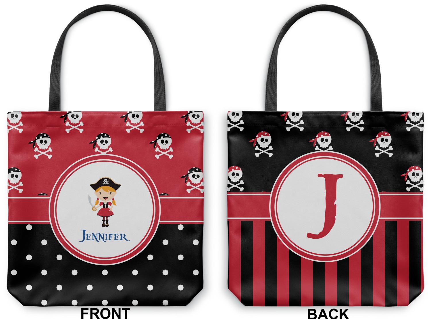 A wide band of red, trimmed in white highlight the little pirate girl in the circle label. Add your personalization in the label to complete the look.