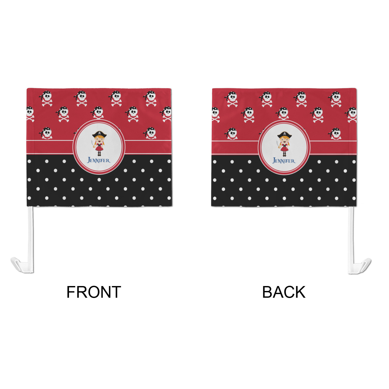 Our personalized flags are made from a durable, yet lightweight cloth that will proudly bear your logo or design of choice, while withstanding the outside elements. We have two size options - 8" x 11" and 11" x 15". Both come with a flag pole which includes a clip that secures the pole to the side window, whether it is rolled up or down. The flags are printed on both sides to display your design from all directions.