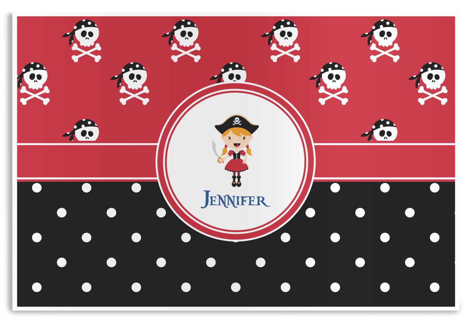 A wide band of red, trimmed in white highlight the little pirate girl in the circle label. Add your personalization in the label to complete the look.