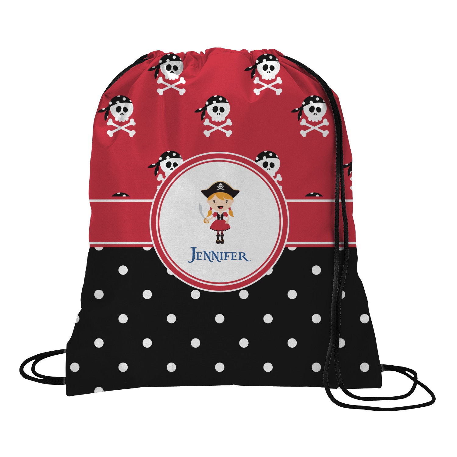 A wide band of red, trimmed in white highlight the little pirate girl in the circle label. Add your personalization in the label to complete the look.