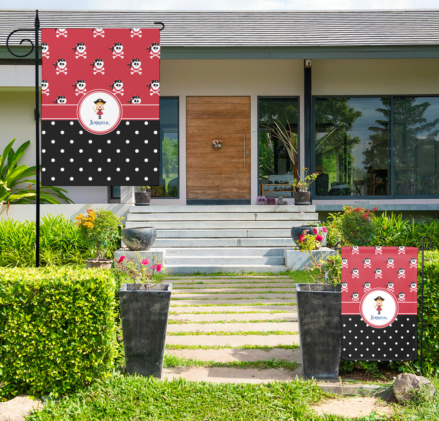 These custom garden flags are made of a durable, double-ply, polyester weave, allowing them to withstand the elements year round. The small flags measure at approximately 12 by 18 inches. The large flags measure out to 28 by 37 inches. You can order these decorative flags with your customization printed on the front only, or the front and back.