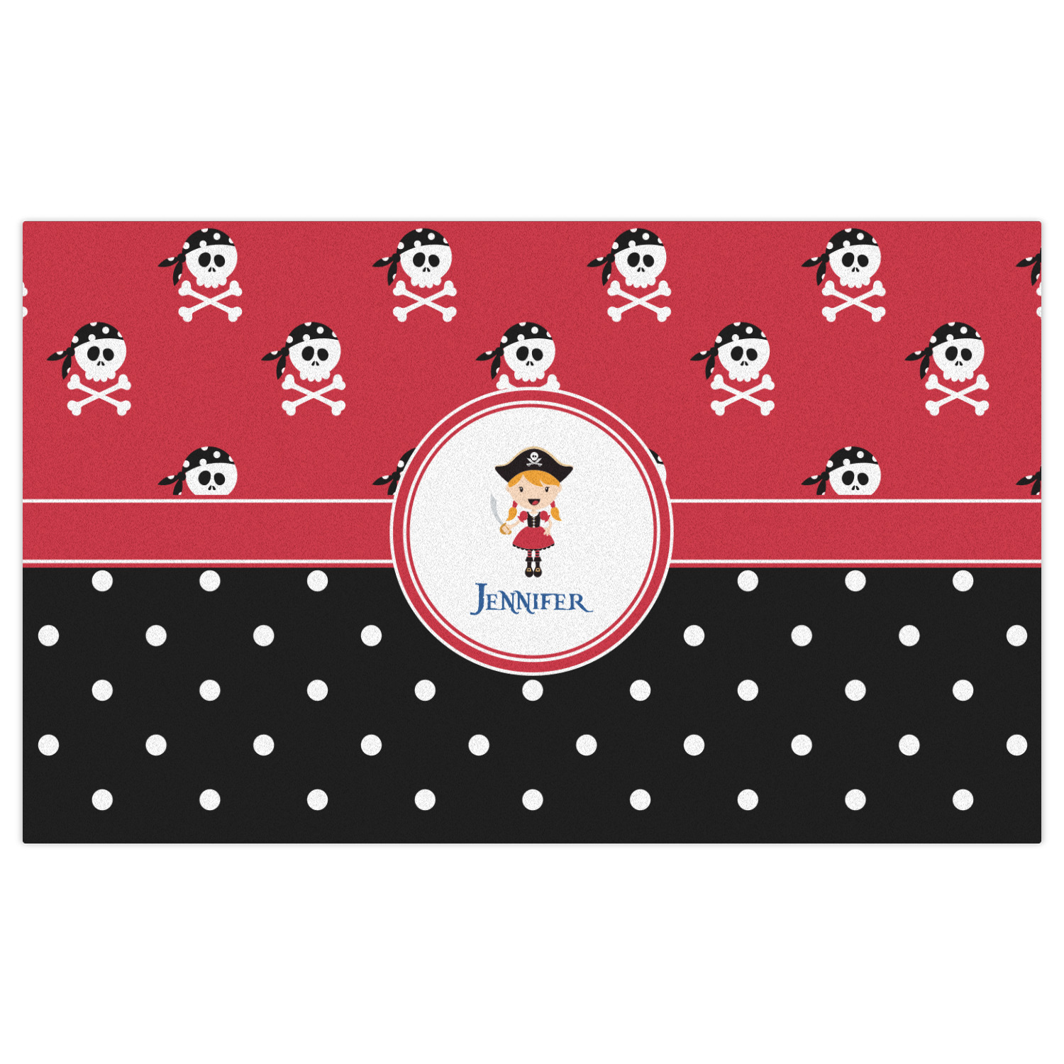 A wide band of red, trimmed in white highlight the little pirate girl in the circle label. Add your personalization in the label to complete the look.