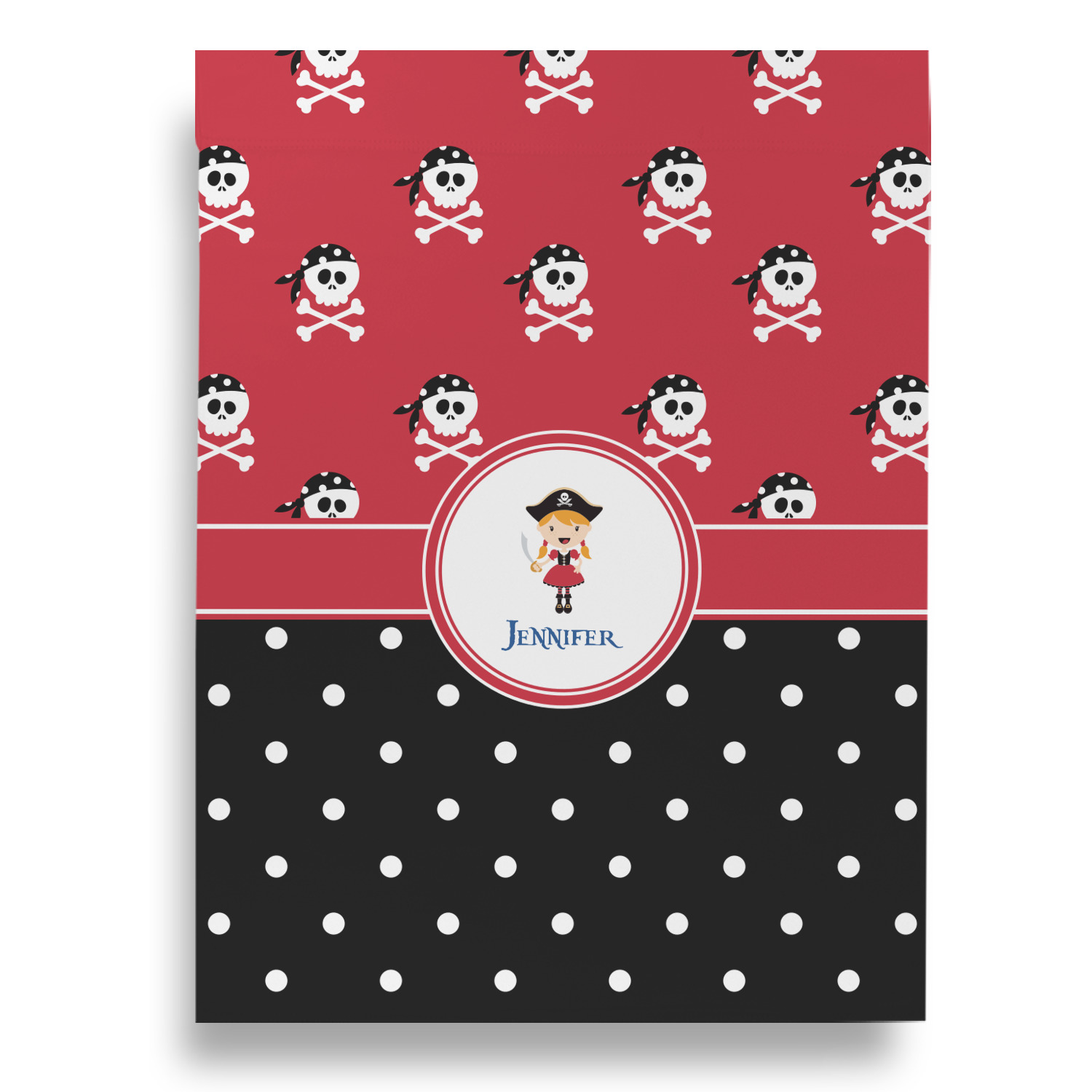 A wide band of red, trimmed in white highlight the little pirate girl in the circle label. Add your personalization in the label to complete the look.