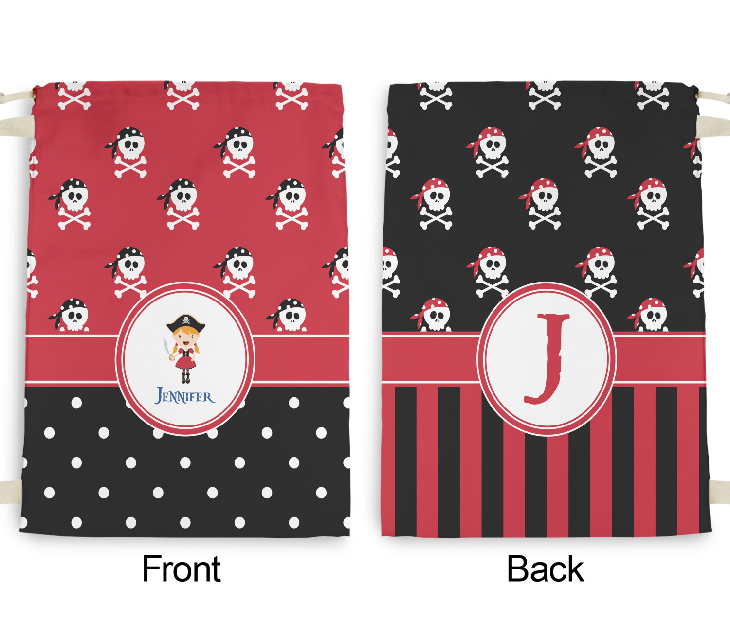 A wide band of red, trimmed in white highlight the little pirate girl in the circle label. Add your personalization in the label to complete the look.