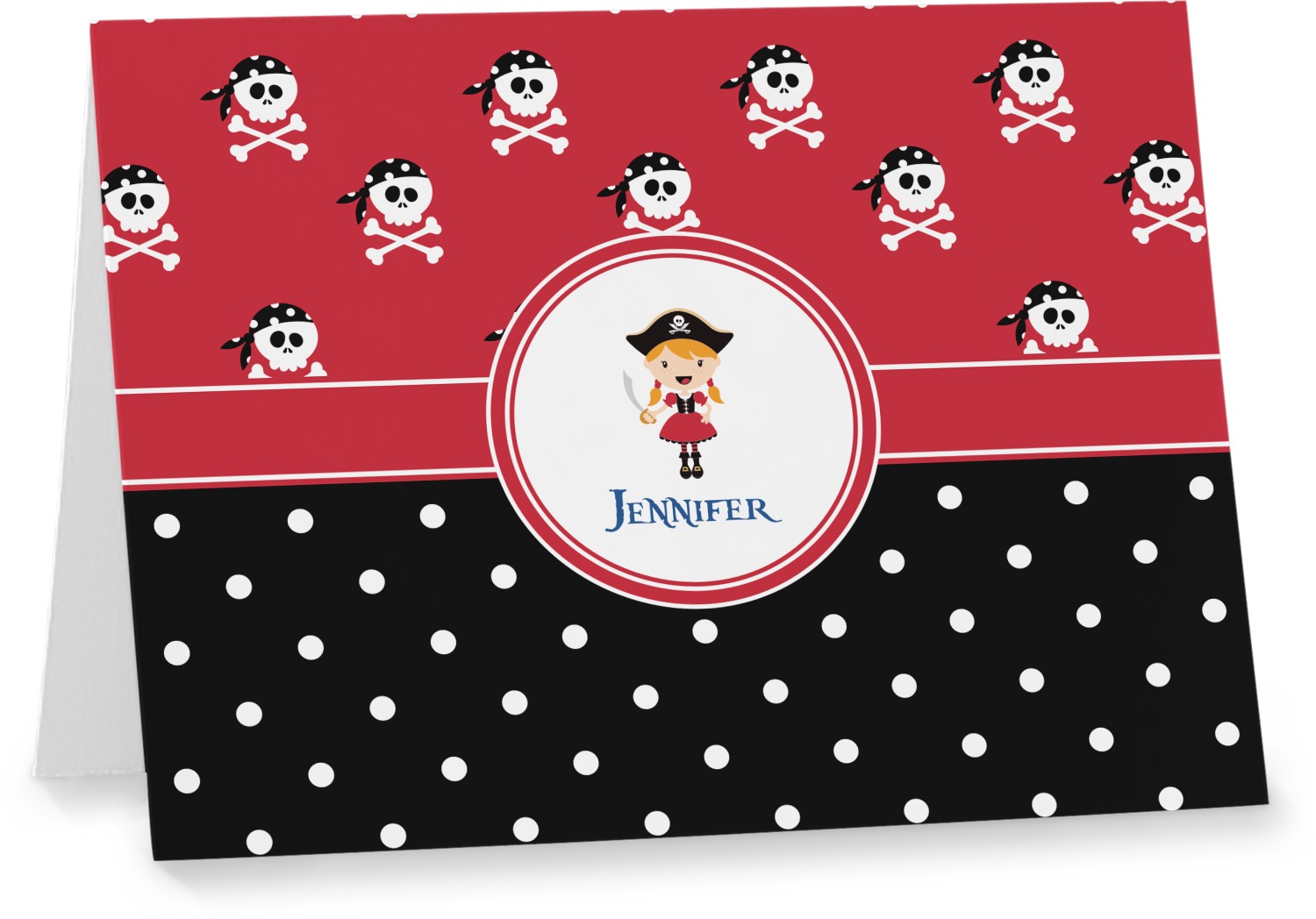 A wide band of red, trimmed in white highlight the little pirate girl in the circle label. Add your personalization in the label to complete the look.