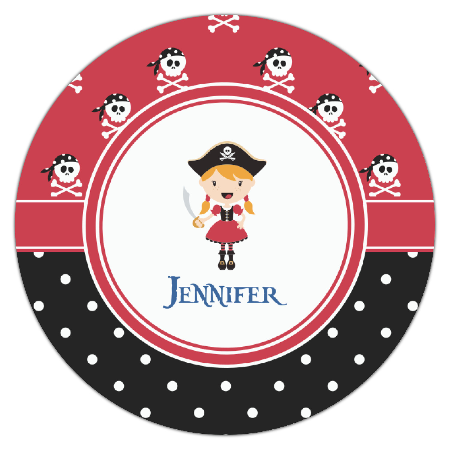 A wide band of red, trimmed in white highlight the little pirate girl in the circle label. Add your personalization in the label to complete the look.
