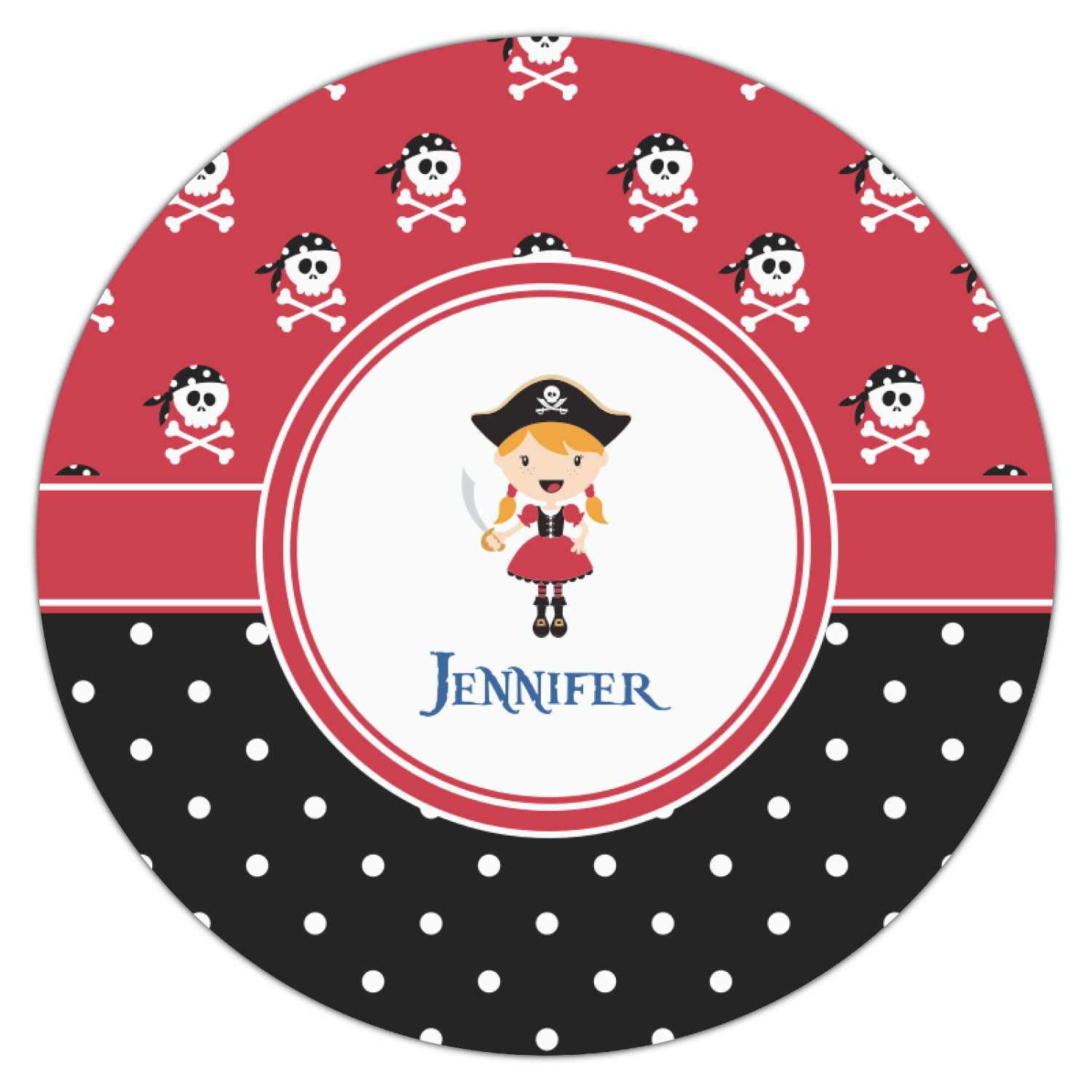 A wide band of red, trimmed in white highlight the little pirate girl in the circle label. Add your personalization in the label to complete the look.
