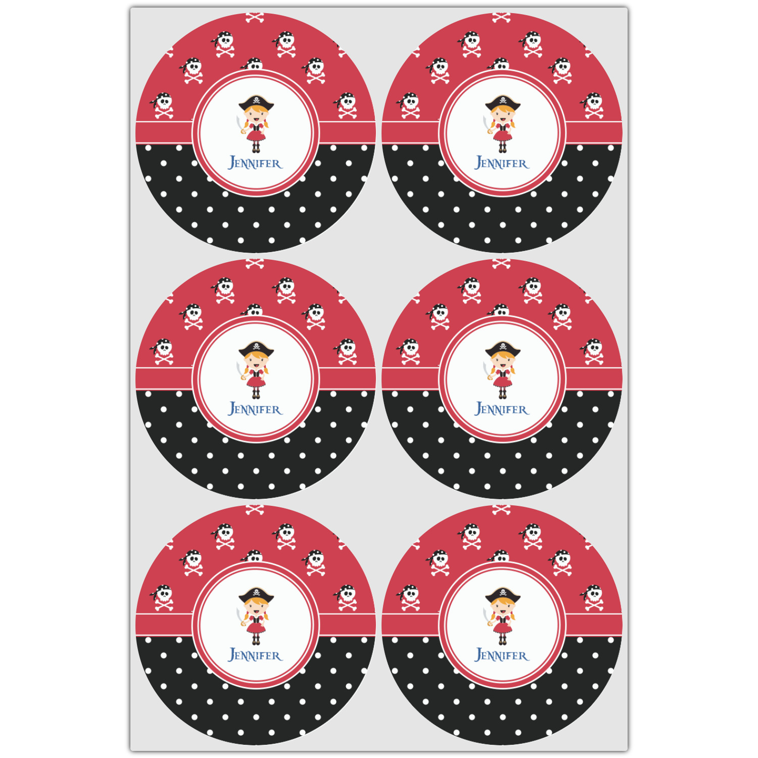 A wide band of red, trimmed in white highlight the little pirate girl in the circle label. Add your personalization in the label to complete the look.