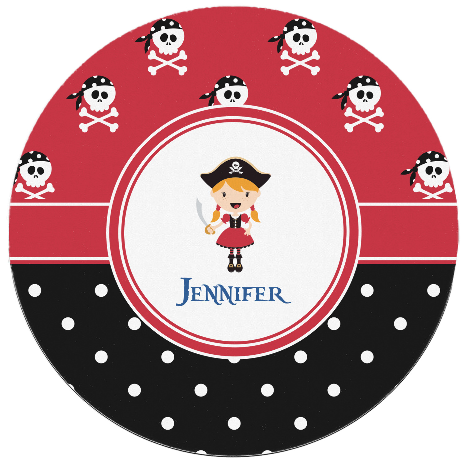A wide band of red, trimmed in white highlight the little pirate girl in the circle label. Add your personalization in the label to complete the look.
