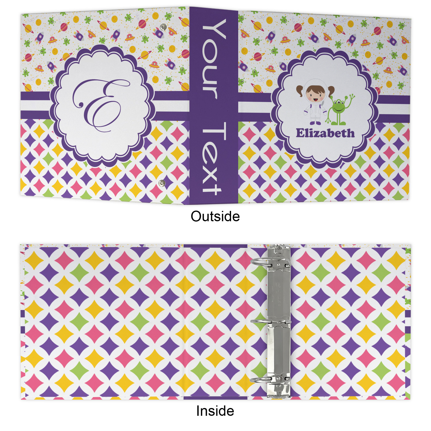 A wide white band trimmed in purple highlights the scallop label showcasing the little girl and her favorite martian personalized with your little one's name.