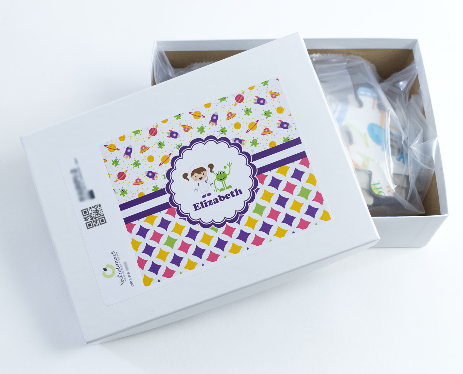 A wide white band trimmed in purple highlights the scallop label showcasing the little girl and her favorite martian personalized with your little one's name.