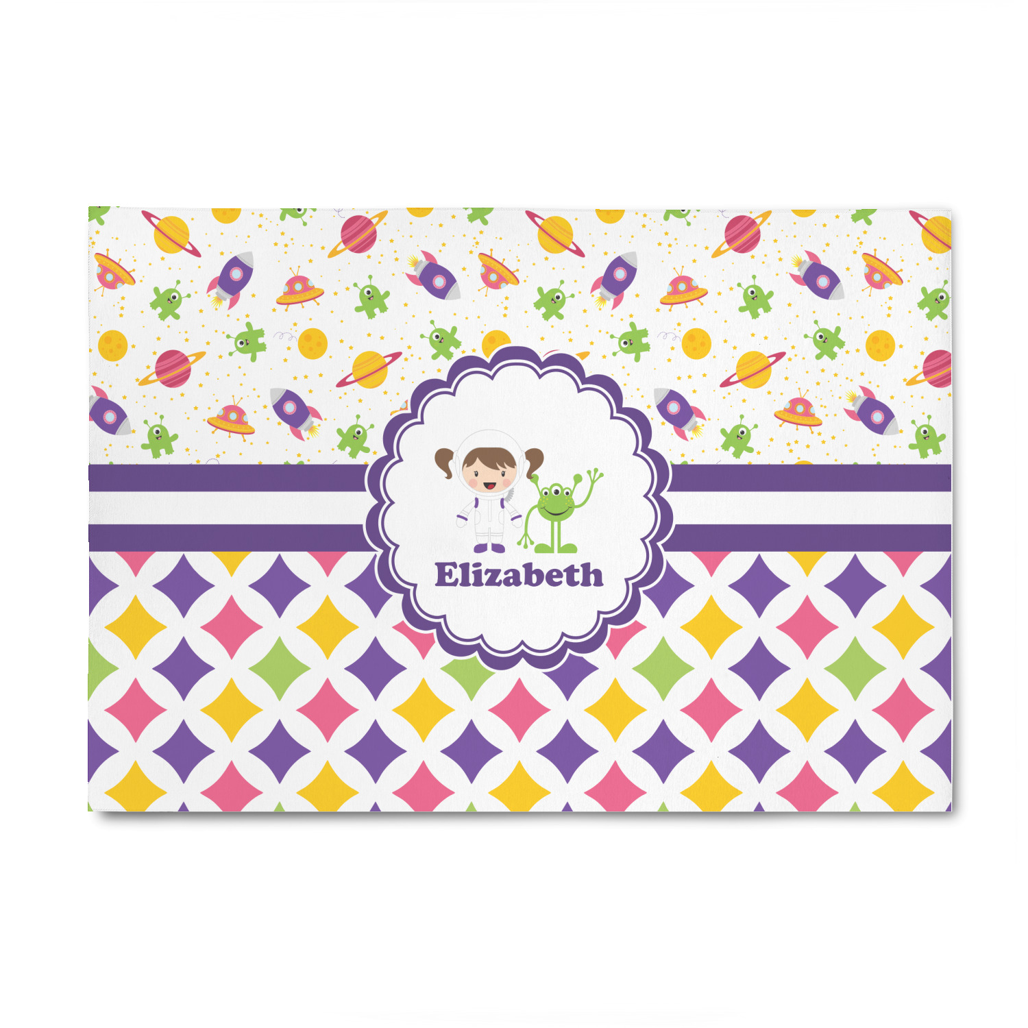 Girls love space exploration too. We have used our popular space design full of little green martians, purple and pink spaceships, yellow and pink planets, and yellow stars galore and paired it with a whimsical diamond pattern using coordinating colors.