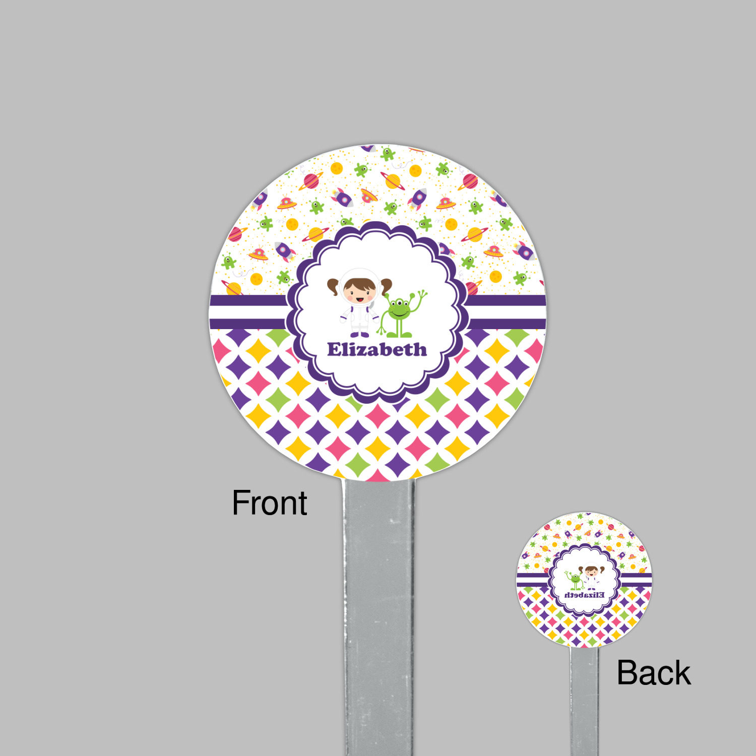 A wide white band trimmed in purple highlights the scallop label showcasing the little girl and her favorite martian personalized with your little one's name.