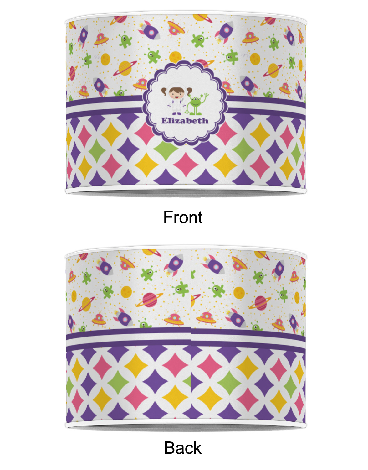 Girls love space exploration too. We have used our popular space design full of little green martians, purple and pink spaceships, yellow and pink planets, and yellow stars galore and paired it with a whimsical diamond pattern using coordinating colors.