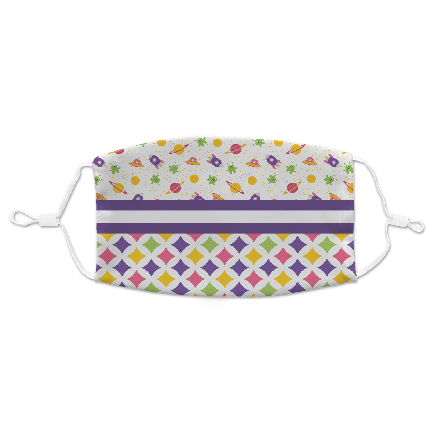 Girls love space exploration too. We have used our popular space design full of little green martians, purple and pink spaceships, yellow and pink planets, and yellow stars galore and paired it with a whimsical diamond pattern using coordinating colors.
