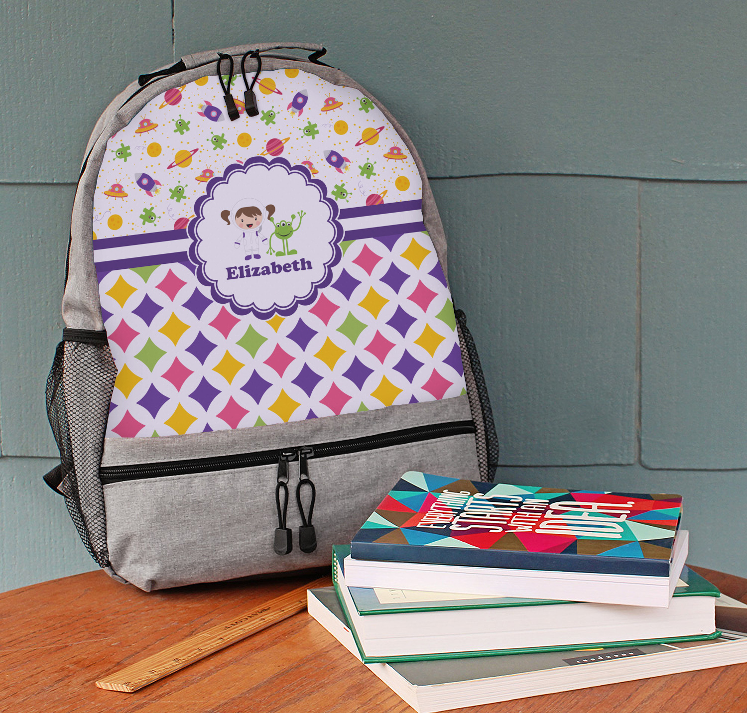 A wide white band trimmed in purple highlights the scallop label showcasing the little girl and her favorite martian personalized with your little one's name.