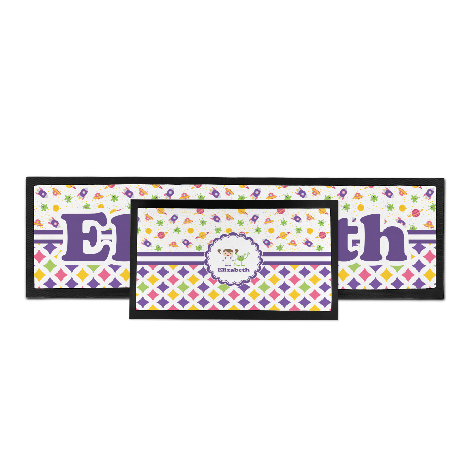 A wide white band trimmed in purple highlights the scallop label showcasing the little girl and her favorite martian personalized with your little one's name.